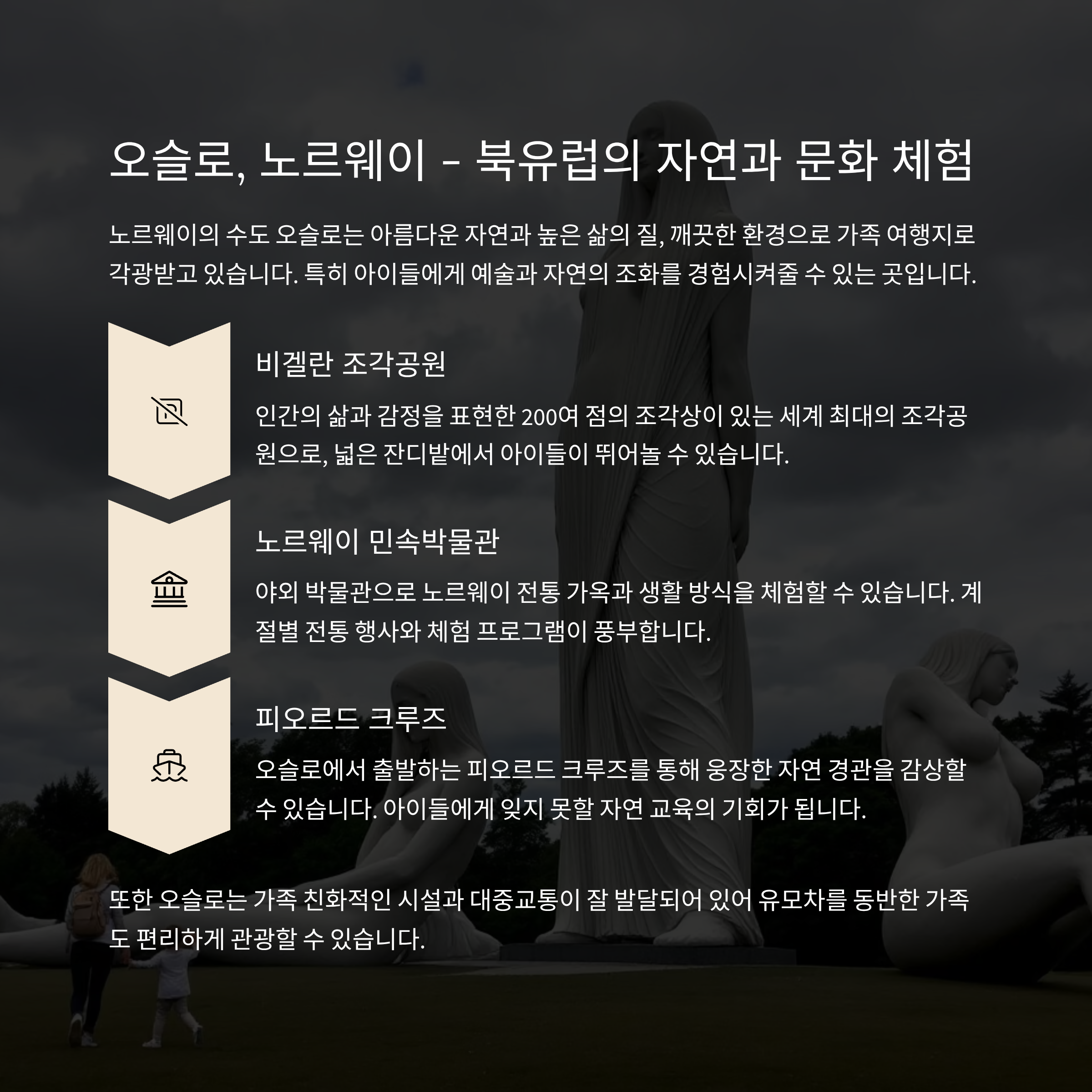 비겔란 조각공원, 노르웨이 민속박물관 같은 공간에서 아이들에게 예술과 문화를 체험시킬 수 있습니다.