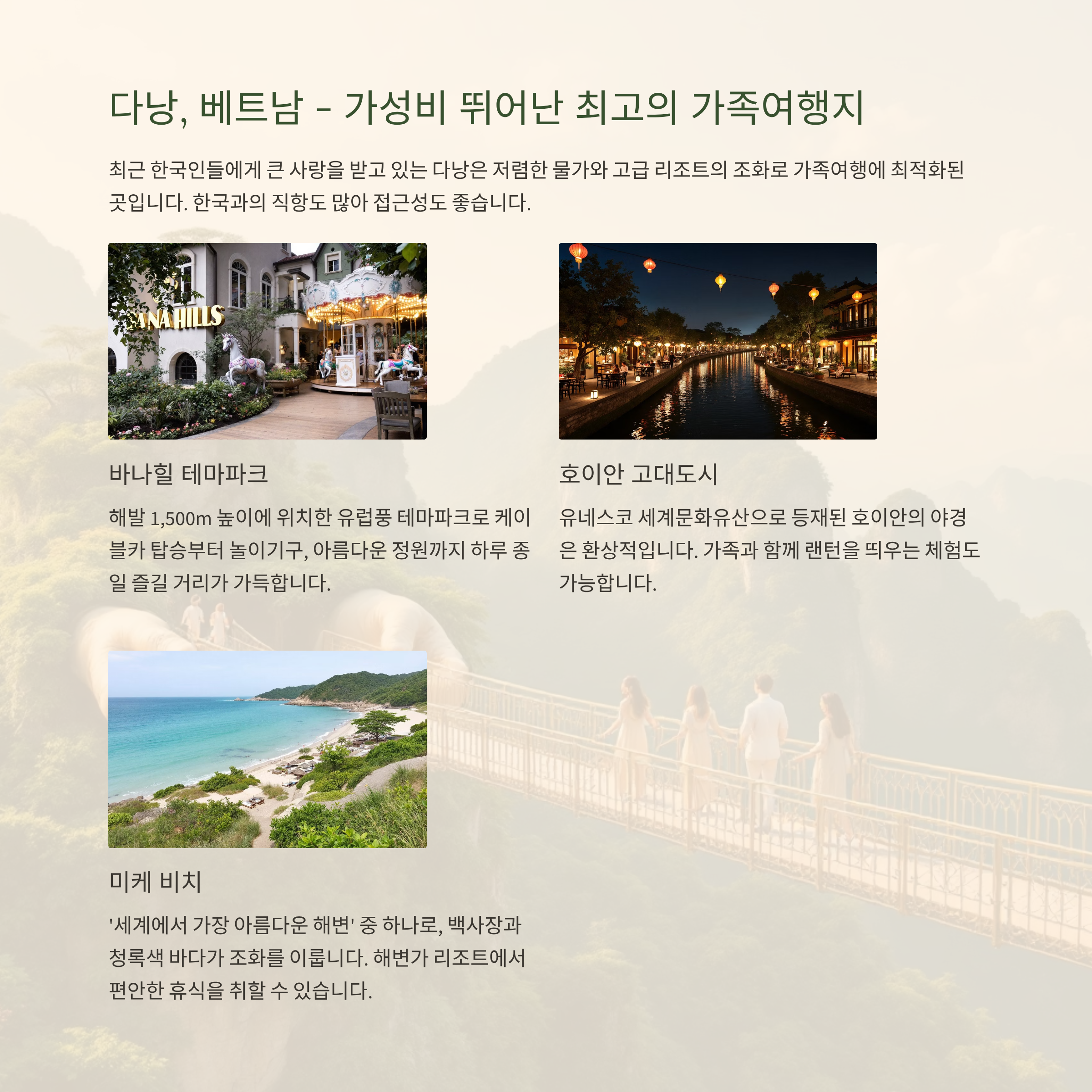 최근 급부상한 다낭은 저렴한 물가와 고급 리조트로 가족여행에 적합합니다.