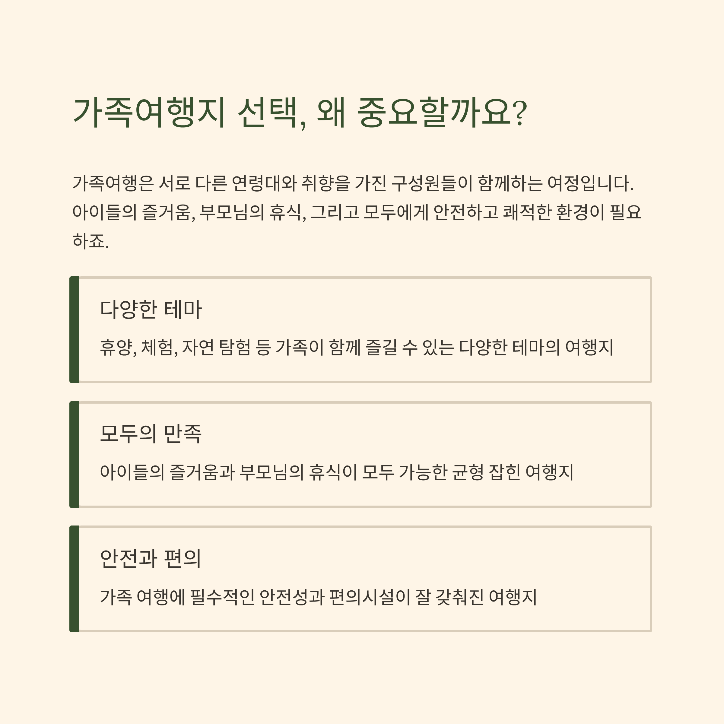 가족여행은 연령대가 다양한 가족 구성원이 모두 만족해야 하기에 여행지를 고를 때 고민이 많습니다.
