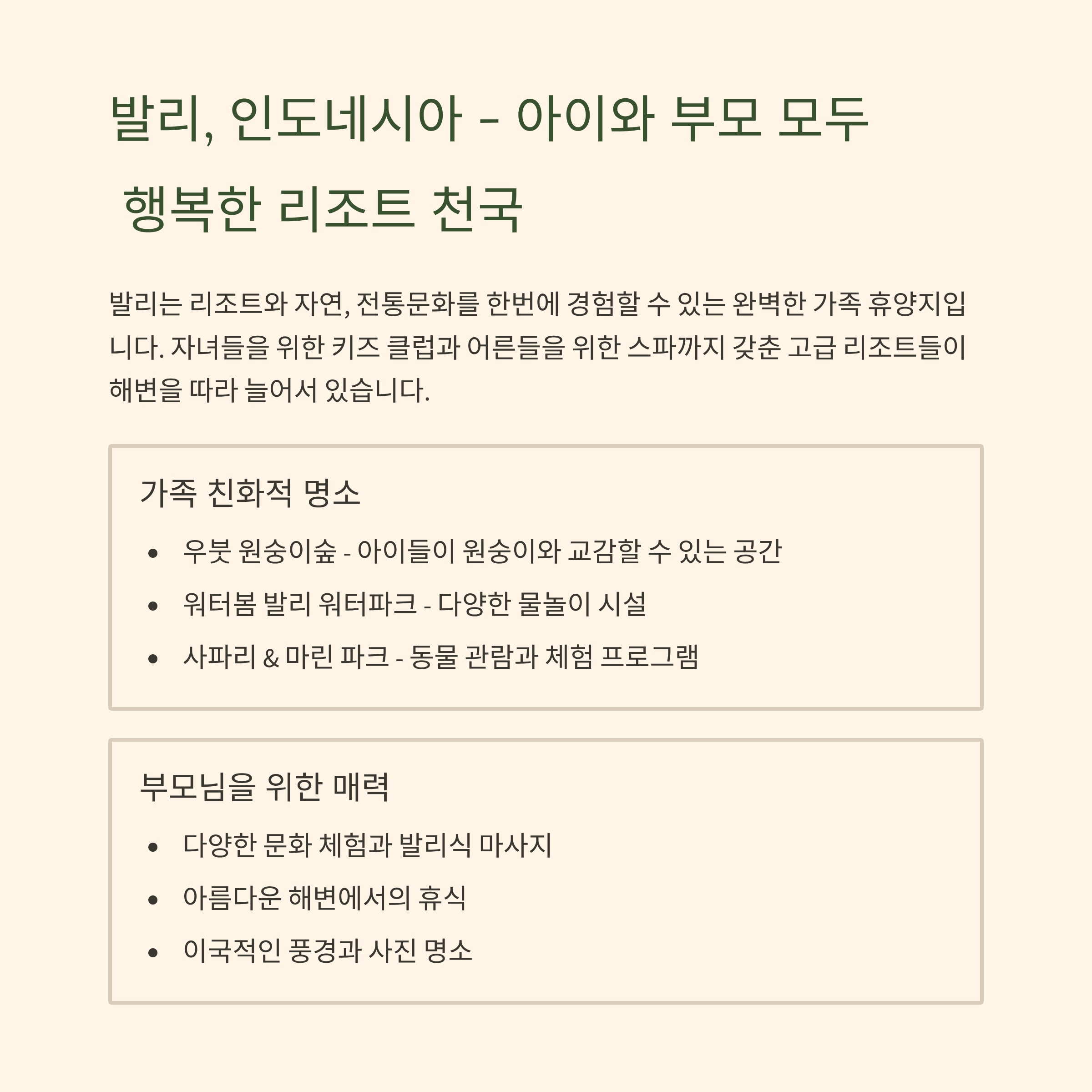 발리는 리조트와 자연, 문화를 함께 누릴 수 있는 대표적인 가족 여행지입니다.