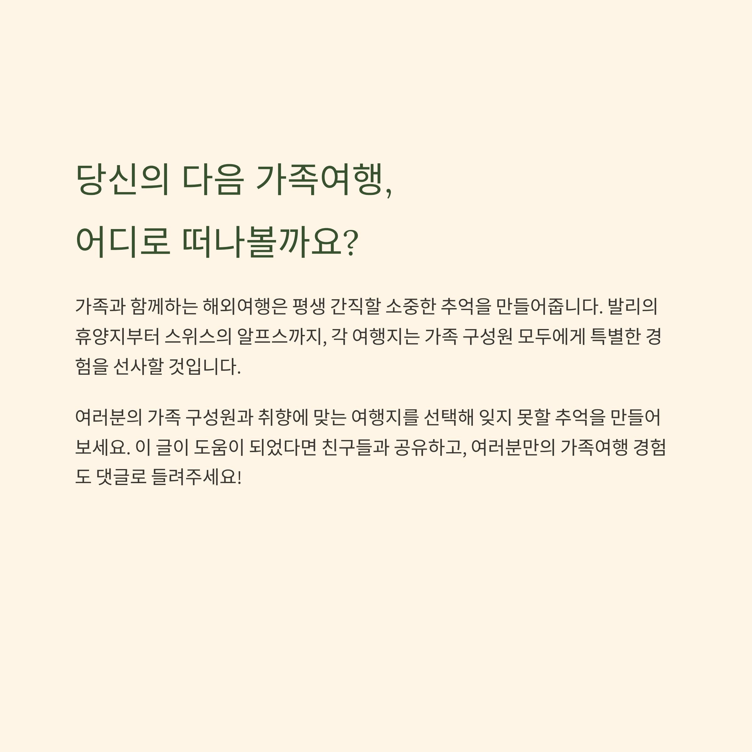 가족여행은 연령대가 다양한 가족 구성원이 모두 만족해야 하기에 여행지를 고를 때 고민이 많습니다.