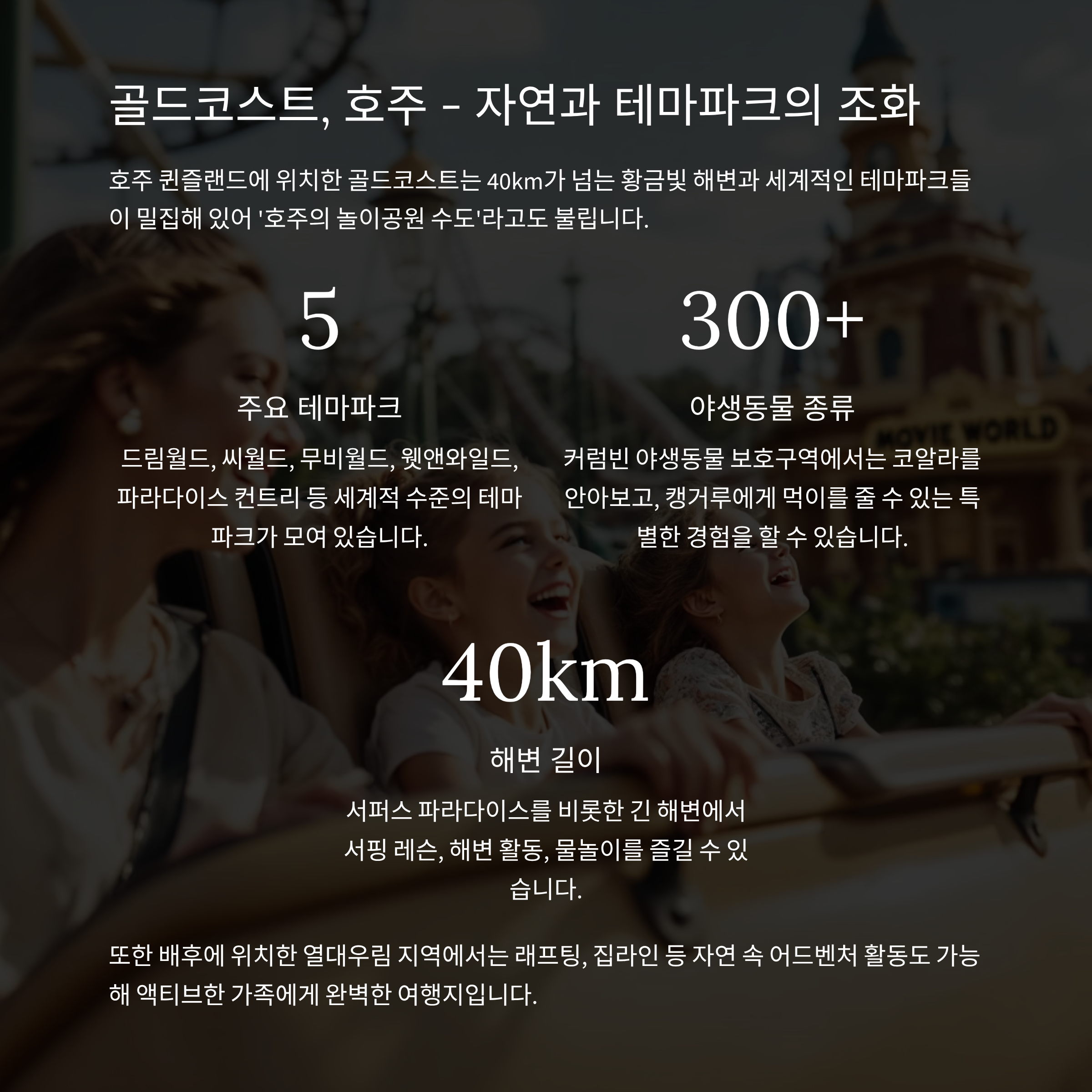 골드코스트는 끝없는 해변과 다양한 테마파크로 유명합니다.