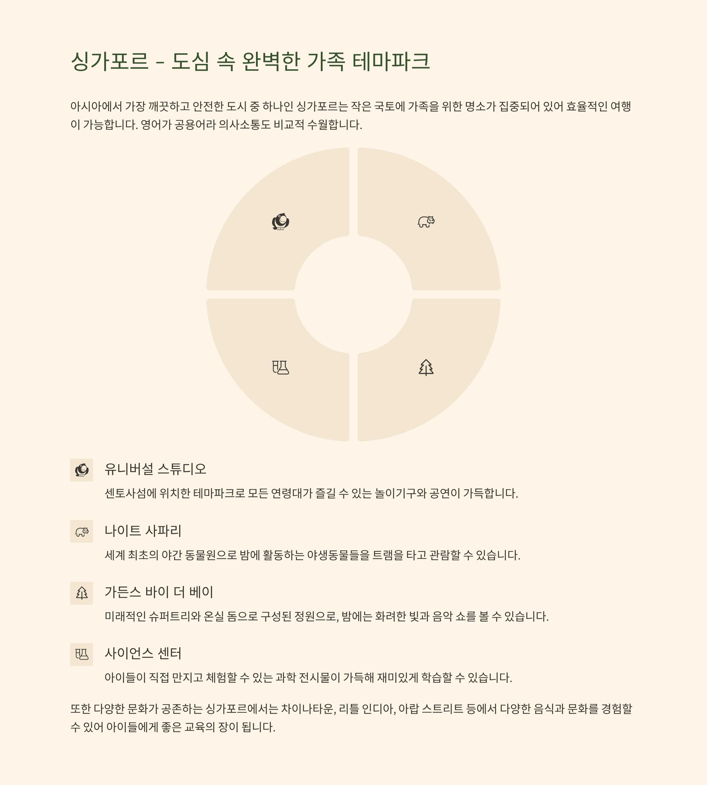 센토사섬, 유니버설스튜디오, 나이트 사파리 등 가족 테마 명소가 집중돼 있습니다.