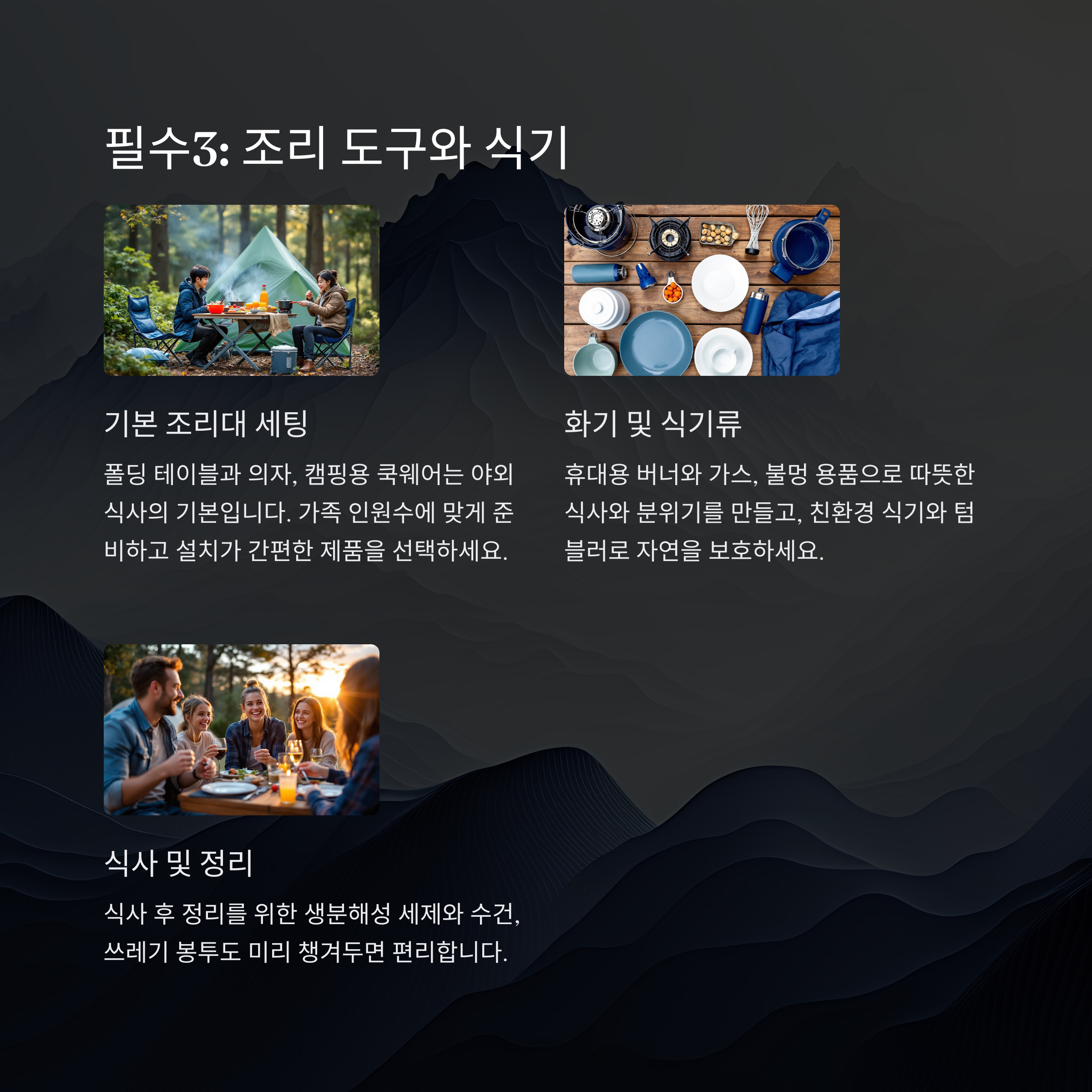 버너, 코펠, 그릴, 집게, 식기류를 빠짐없이 챙기세요.