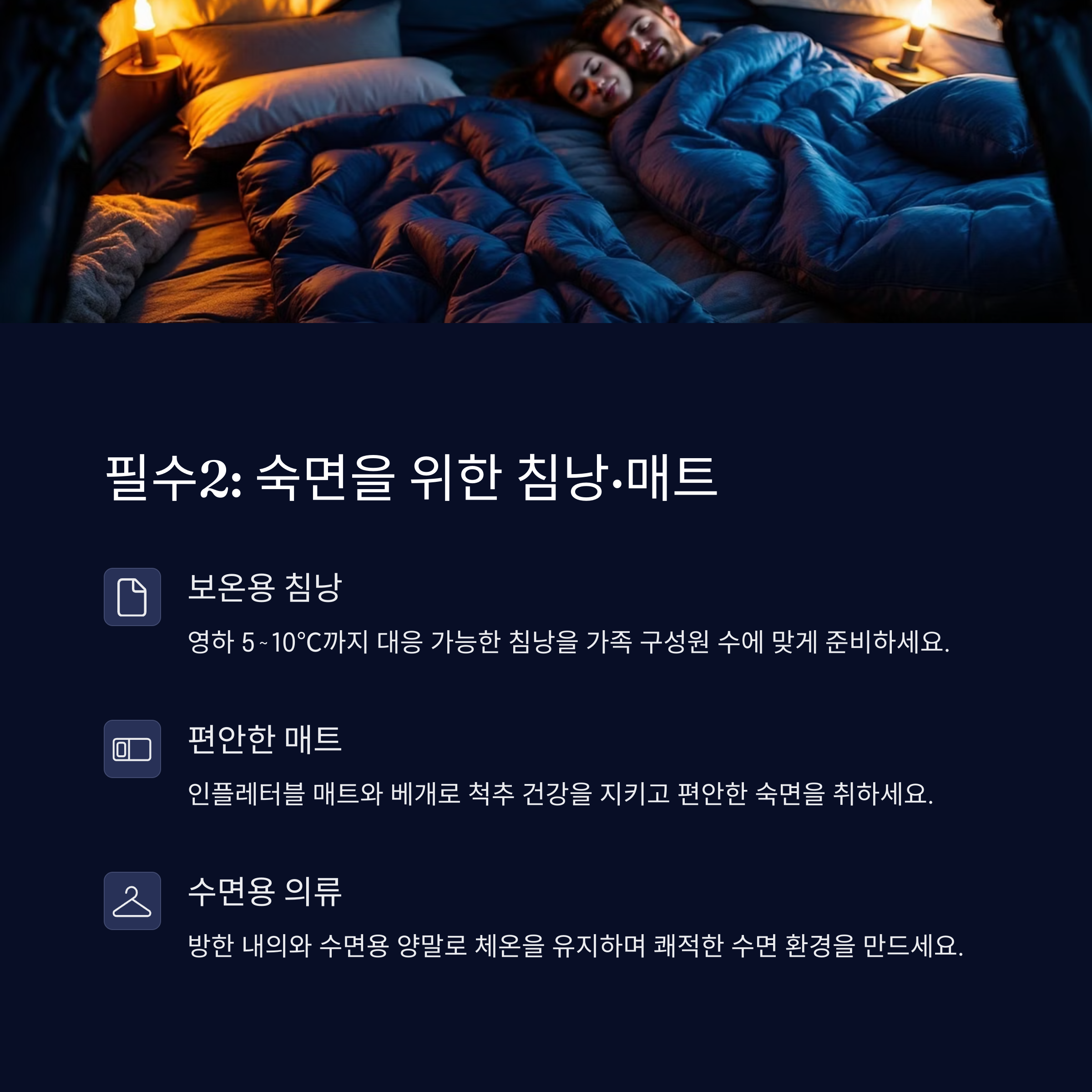 "두툼한 매트와 보온성 좋은 침낭은 필수템이에요"