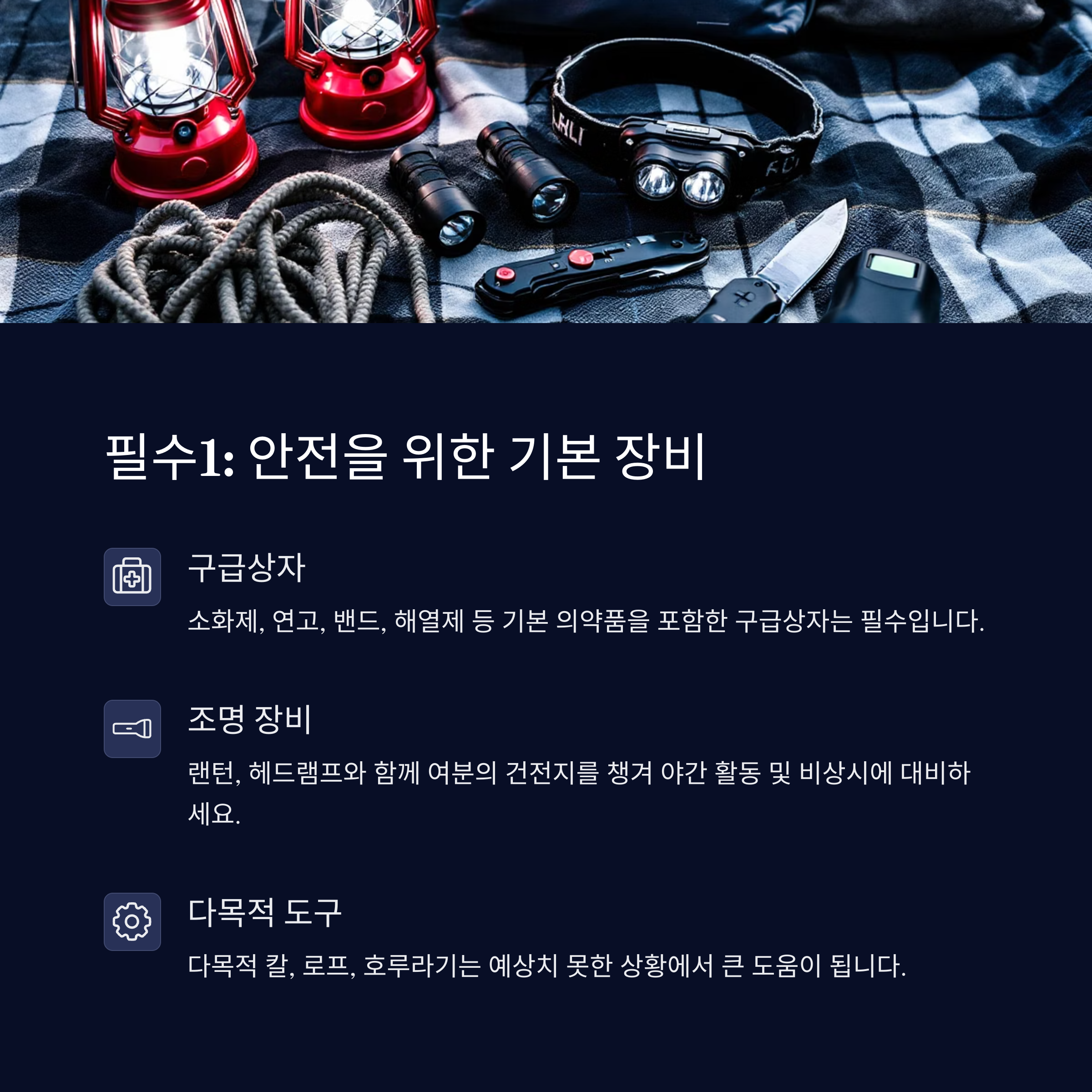 "랜턴, 구급약, 멀티툴, 소화기 등 비상용품은 반드시 챙기세요"