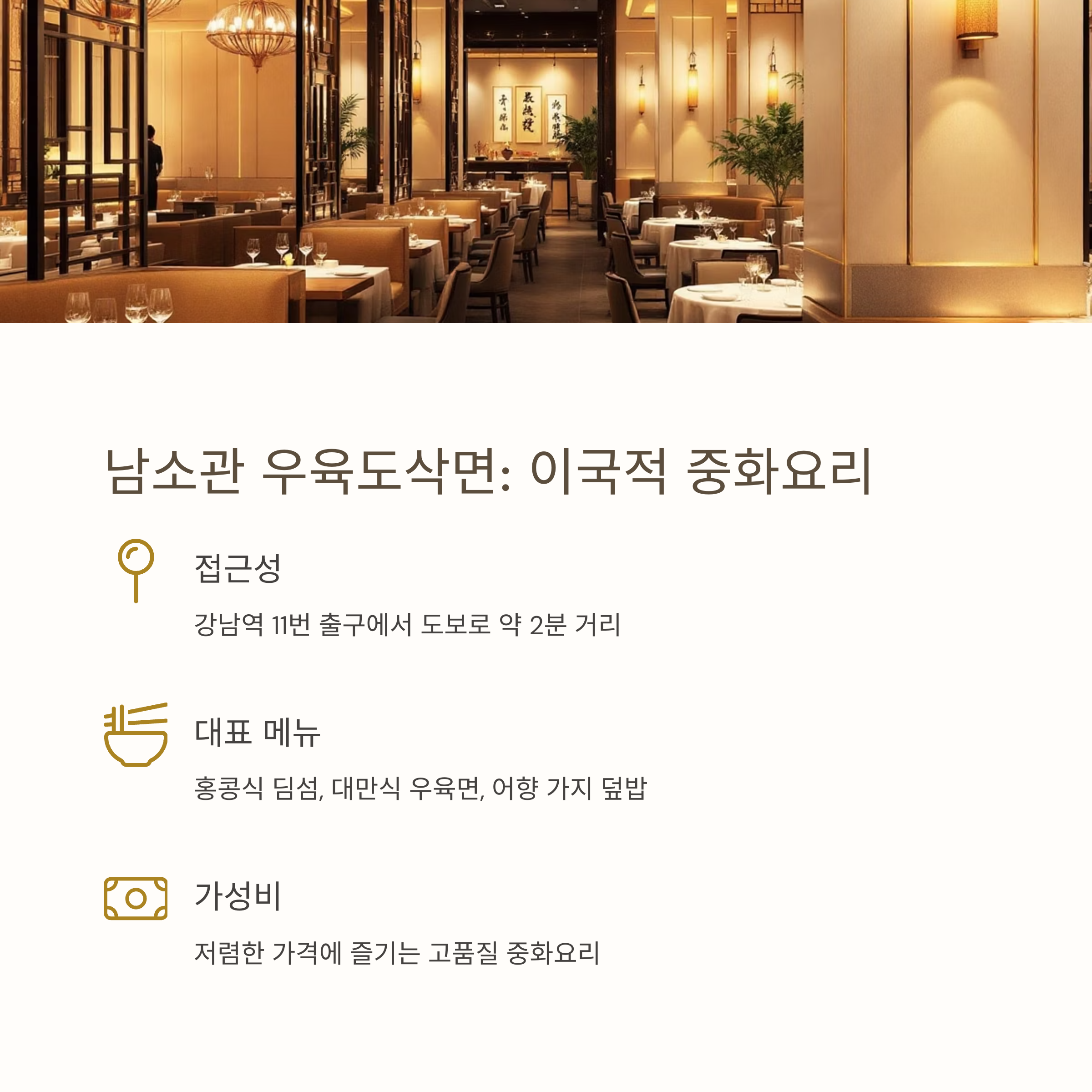 | 남소관 우육도삭면 | 우육면, 딤섬 | 이국적인 인테리어 | 강남역 11번 출구 도보 2분 |