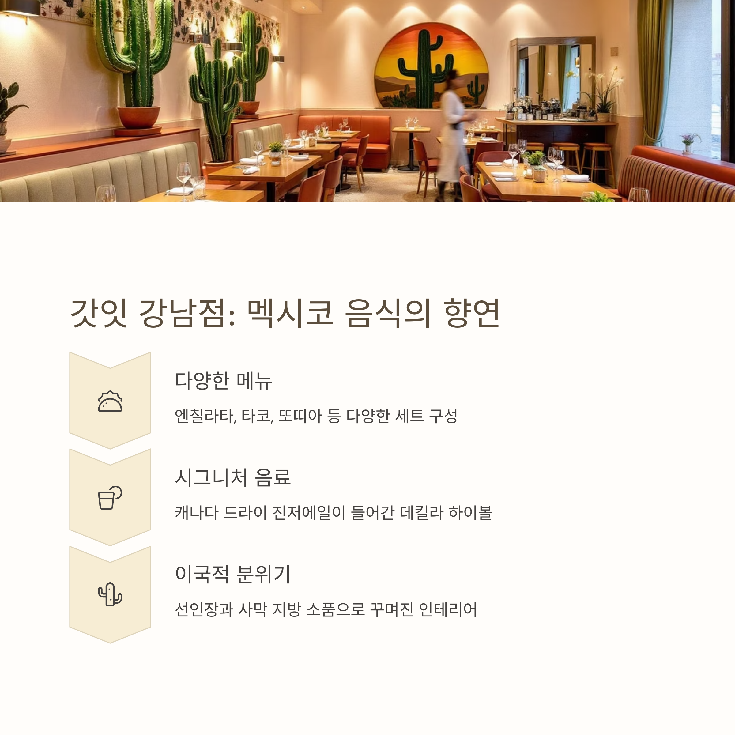 | 갓잇 강남점 | 엔칠라타, 타코 | 멕시코&남미 감성 | 강남역 인근 |