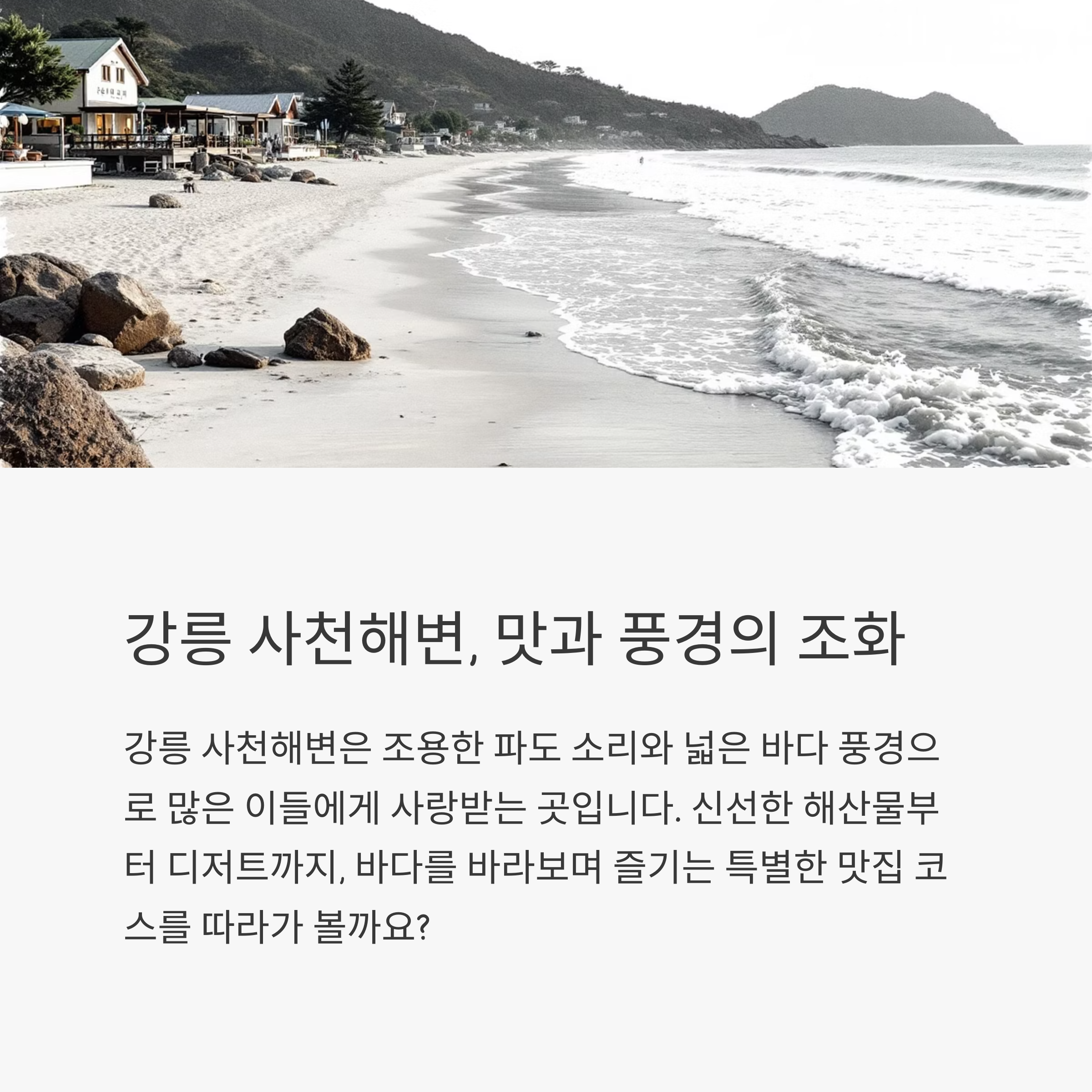 강릉 사천해변은 조용한 파도 소리와 넓은 바다 풍경으로 많은 이들에게 사랑받는 곳입니다. 오늘은 사천해변을 따라 걷다 만날 수 있는 특별한 맛집 3곳을 소개해 드리겠습니다. 신선한 해산물 요리부터 디저트 카페까지, 바다를 바라보며 즐기는 코스로 구성했으니 여행 계획에 참고해 보시길 바랍니다.
