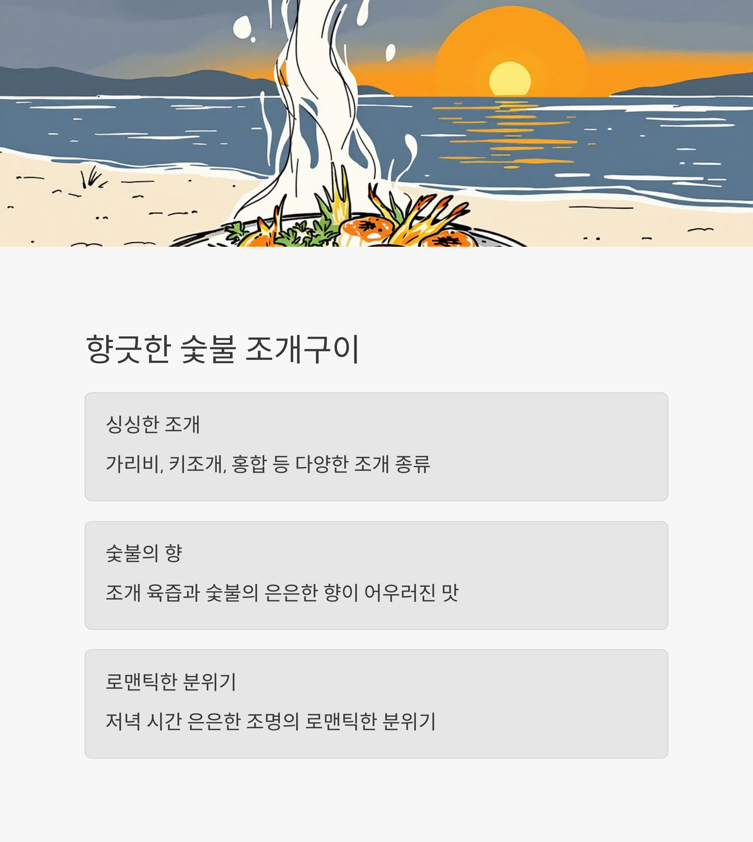 로맨틱한 분위기가 조성됩니다. 조개에서 나오는 육즙과 숯불의 은은한 향이