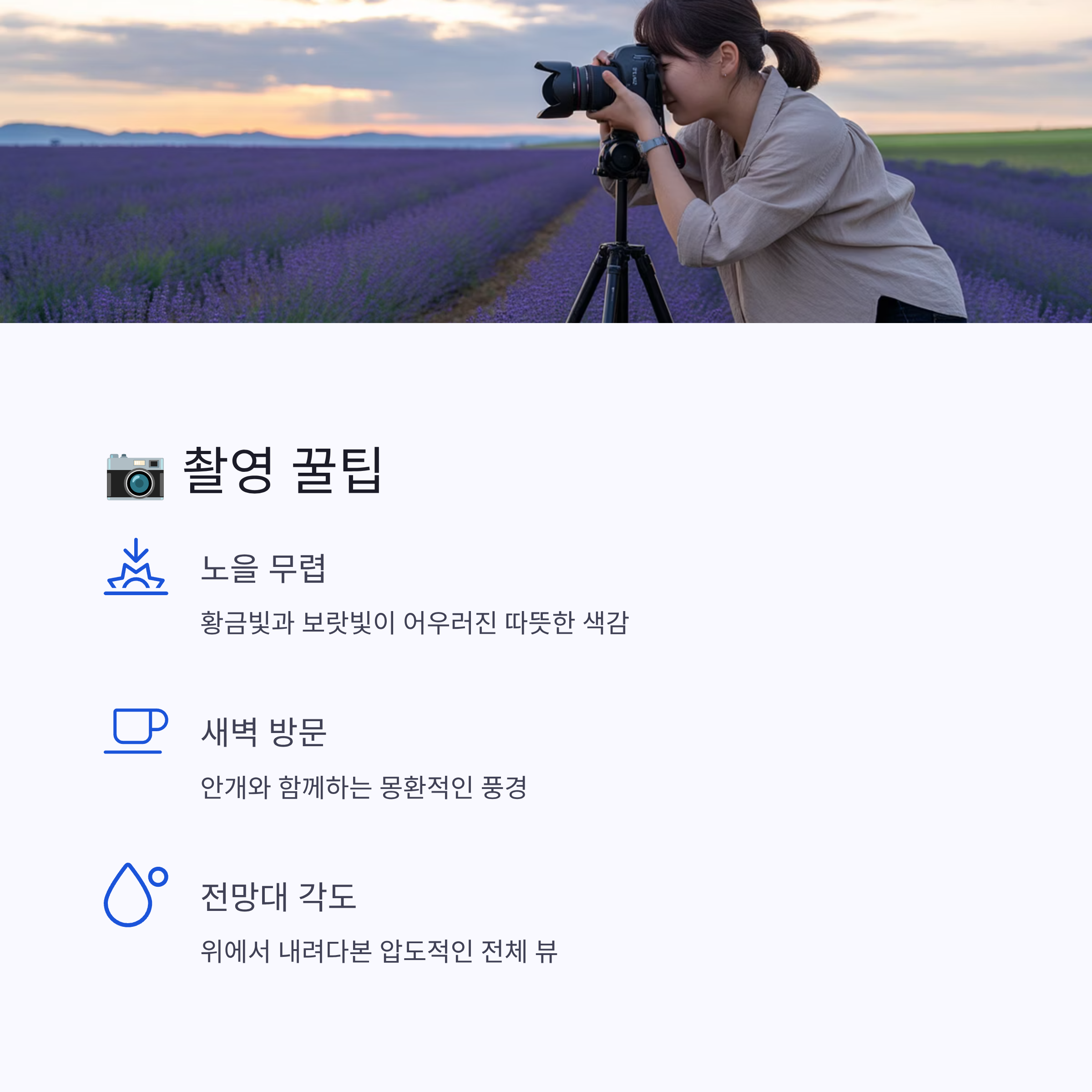 - 새벽 방문: 이른 시간 안개가 남아 있으면 몽환적인 풍경을 담을 수 있습니다.