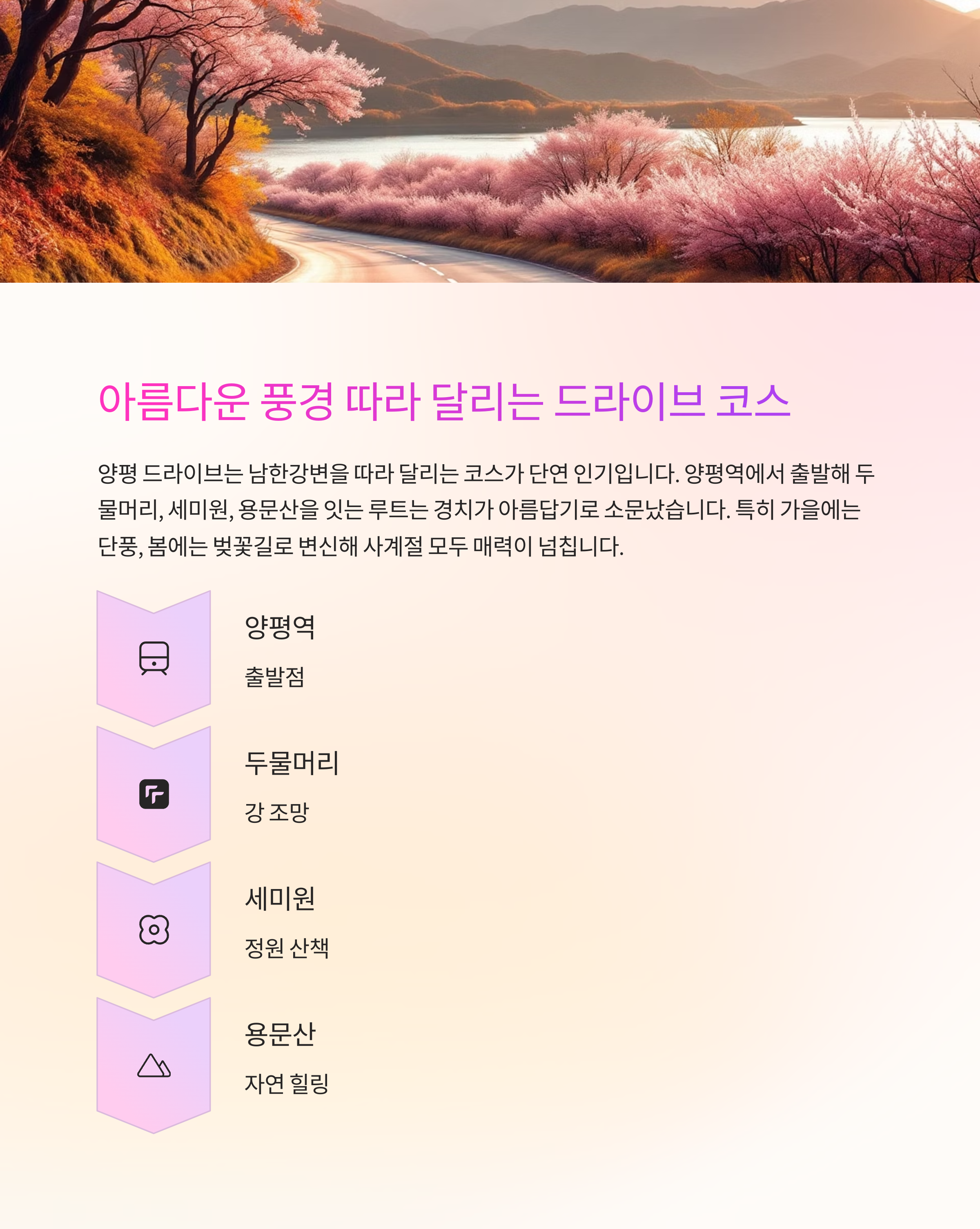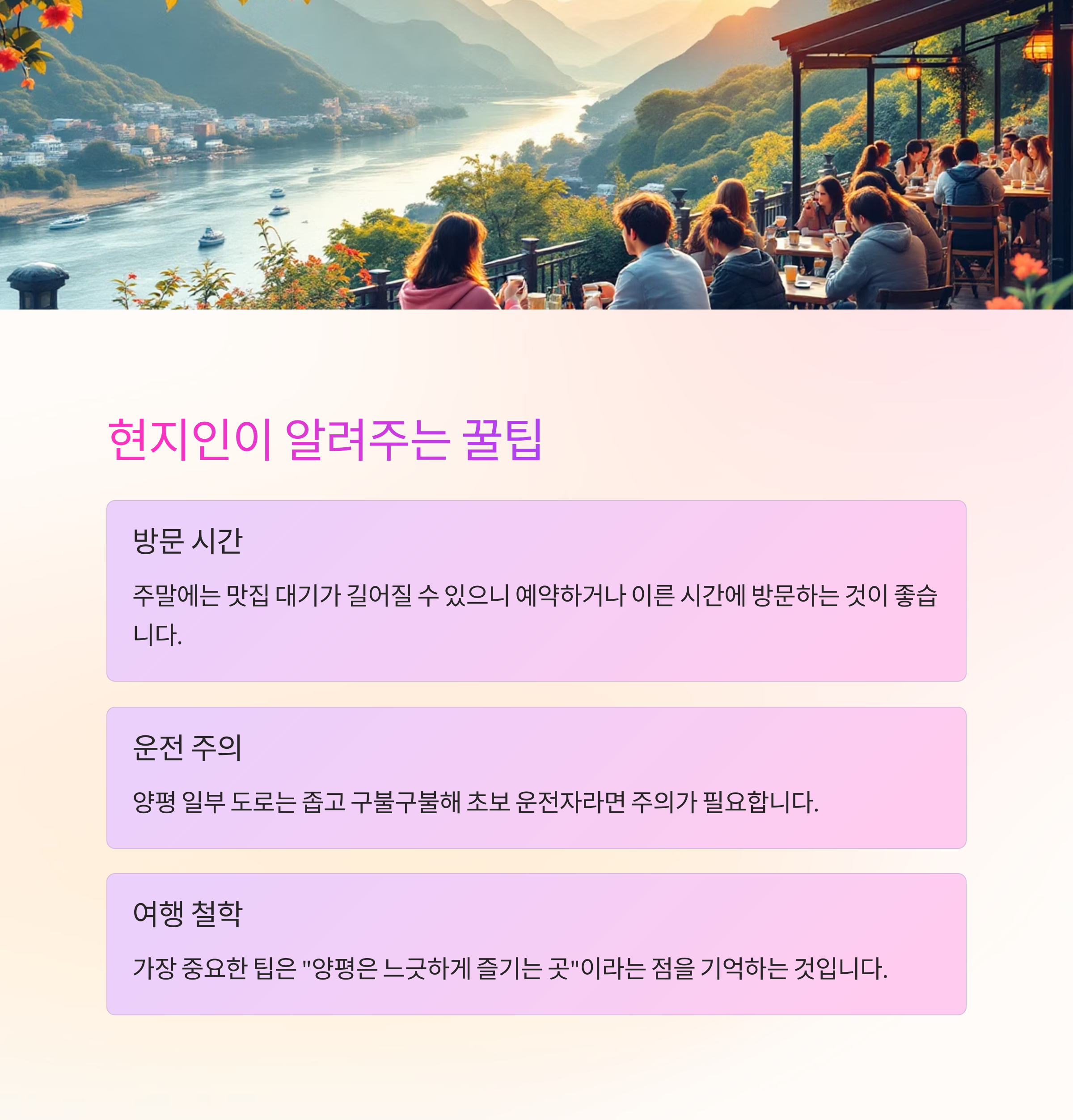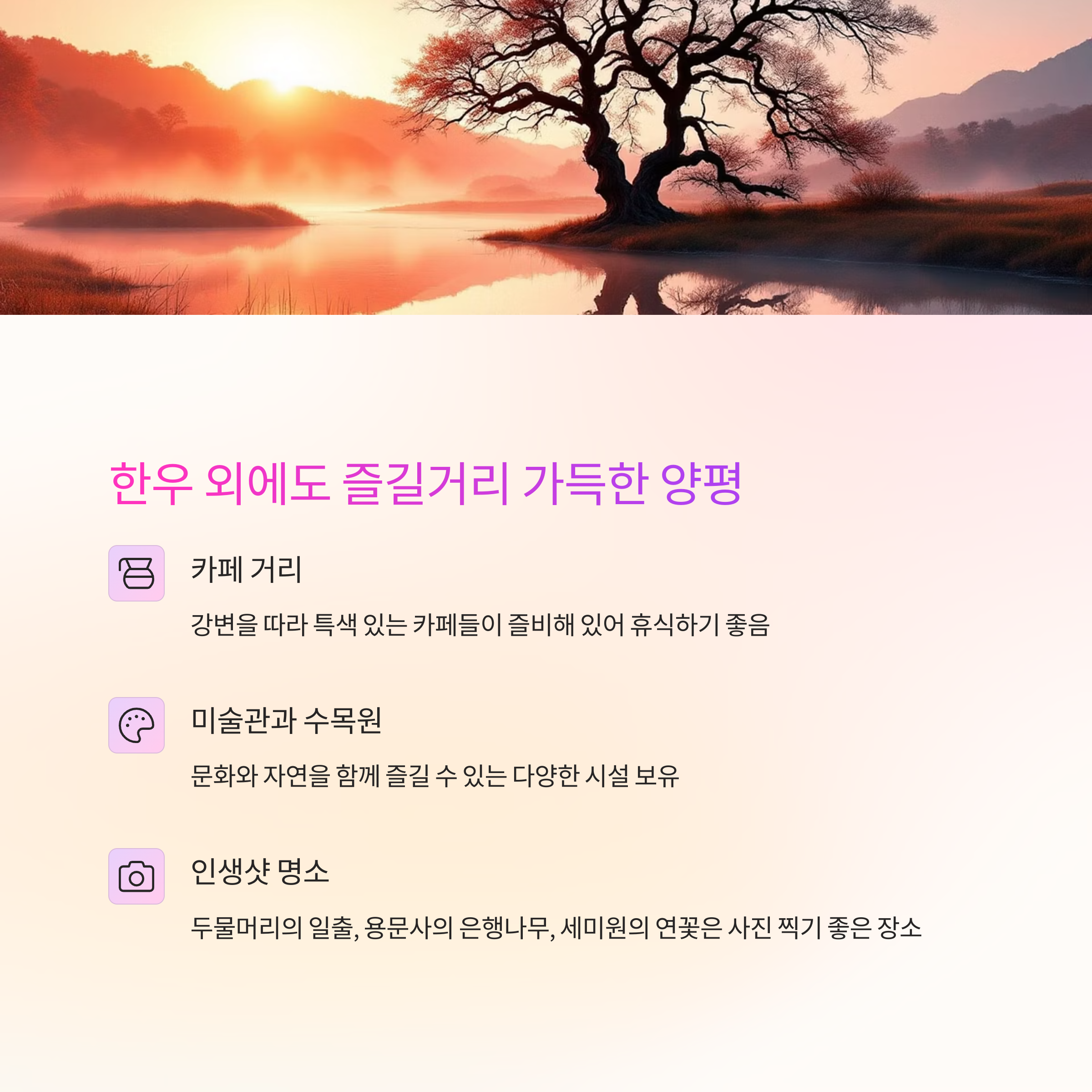 가장 중요한 팁은 “양평은 느긋하게 즐기는 곳”이라는 점을 기억하는 것입니다.