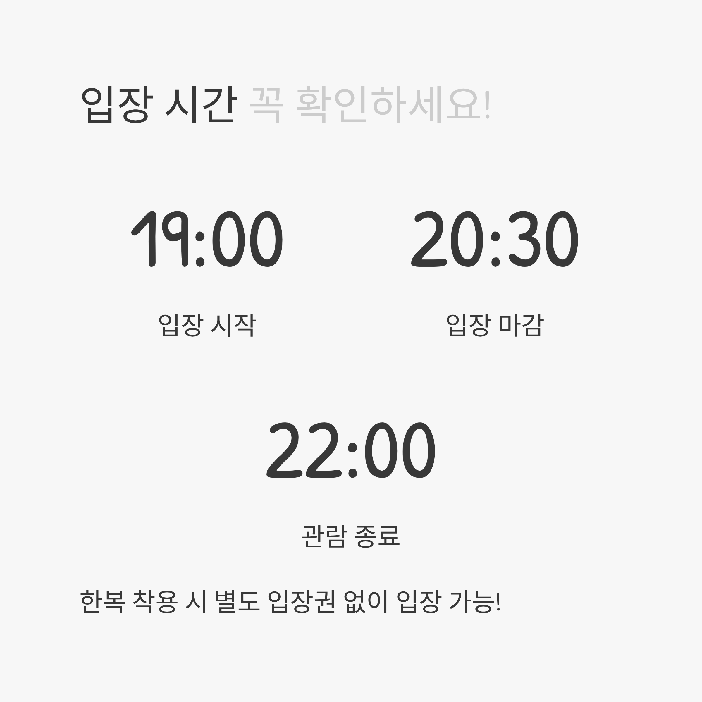 입장 시간은 보통 오후 7시부터 시작되어 8시 30분까지 입장이 가능합니다.