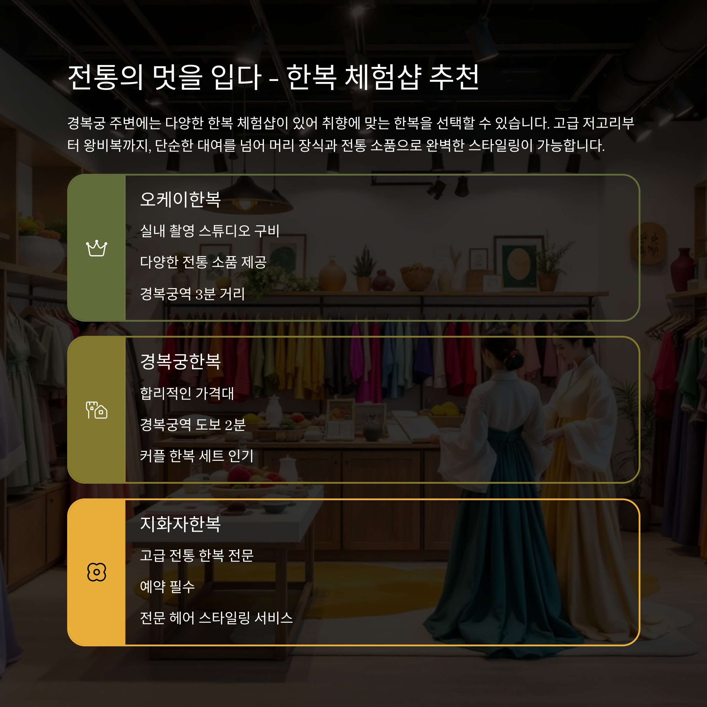 인근에 위치한 체험 샵에서는 고급 저고리, 왕비복 등 다양한 콘셉트의 한복을 제공합니다.