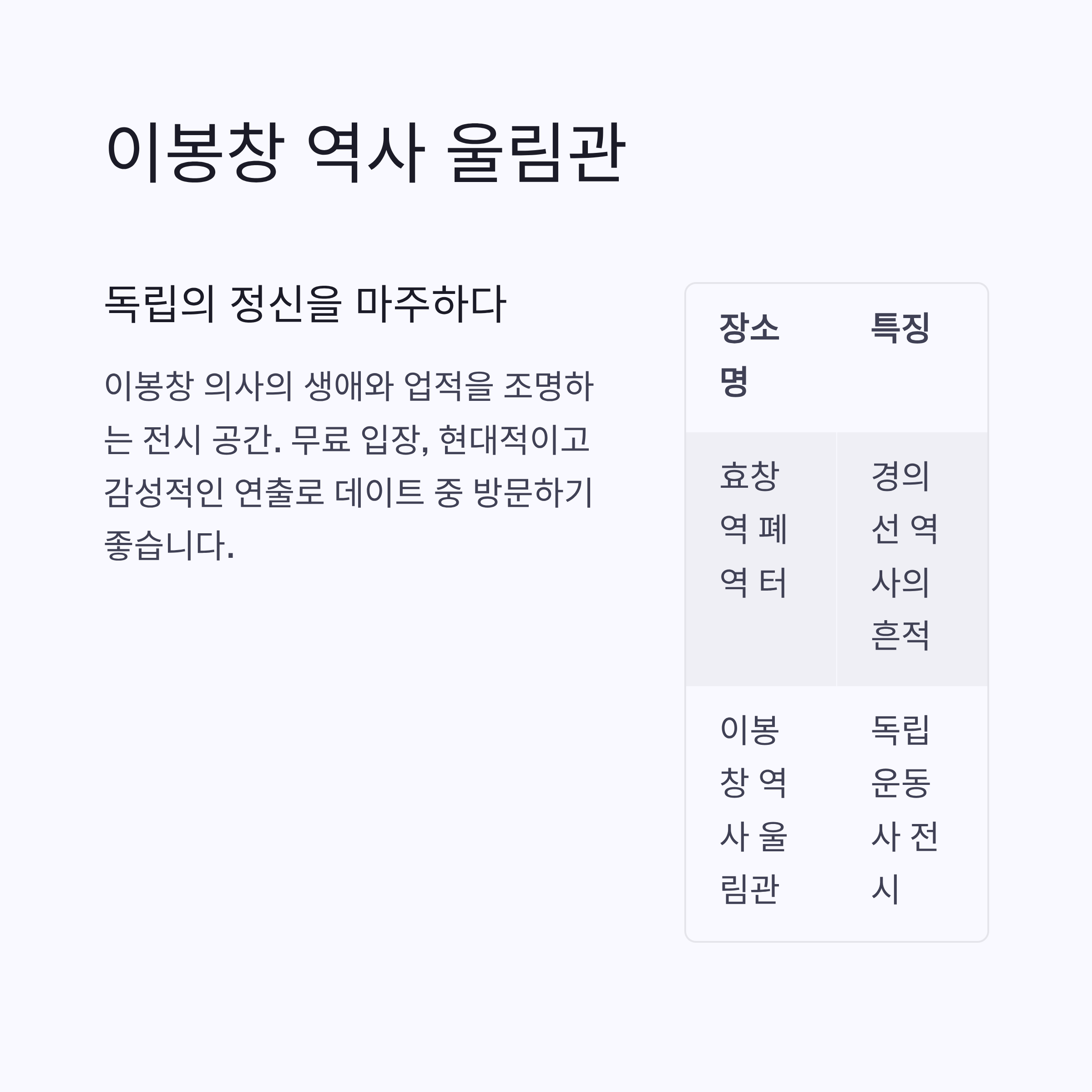 | 이봉창 역사 울림관 | 독립운동사 소개, 전시와 영상 상영 포함 |