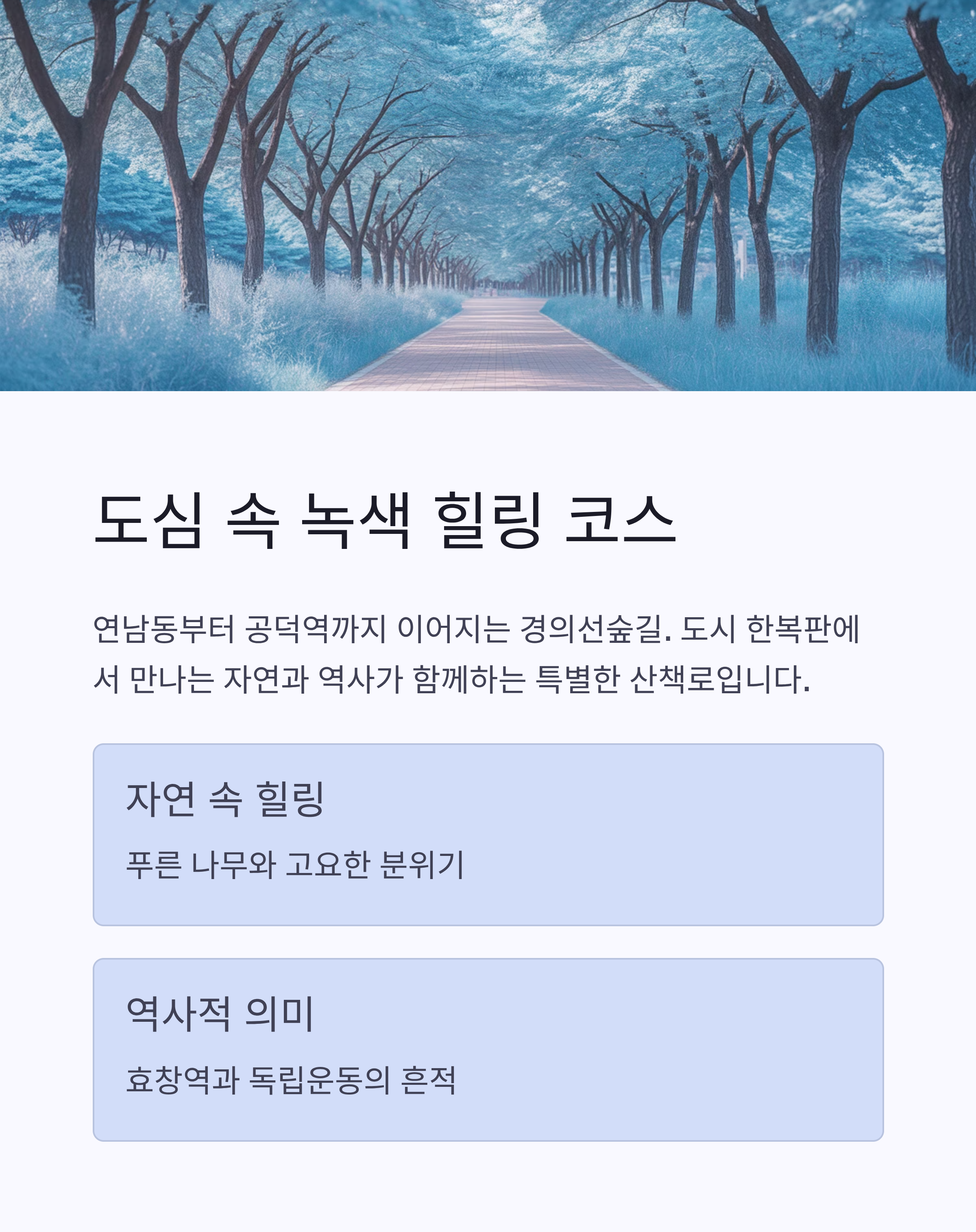 서울 속에서도 조용한 분위기와 자연을 동시에 즐길 수 있는 곳을 찾고 계신가요? 그렇다면 경의선숲길 산책 코스가 제격입니다. 연남동부터 시작해 가좌역, 공덕역까지 이어지는 이 길은 도시 한복판에서 만나는 녹색 힐링 코스로, 걷기만 해도 마음이 정화되는 기분을 선사하죠. 여기에 과거 ‘폐역’이었던 효창역과 독립운동가 이봉창 의사의 이름을 딴 ‘이봉창 역사 울림관’까지 더해져, 하루 산책이 역사적인 울림으로 이어지는 특별한 데이트 코스를 완성합니다.