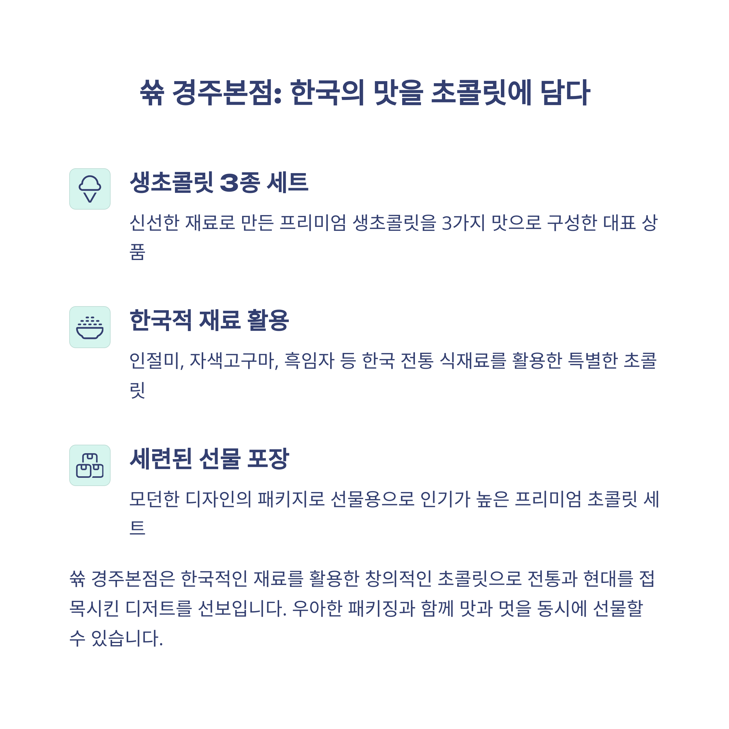 마지막으로 소개할 곳은 '쑥' 경주본점'입니다. 이곳은 한국적인 재료를 활용한 생초콜릿 3종 세트로 유명합니다. 인절미, 자색고구마, 흑임자 초콜릿은 부드럽고 깊은 맛을 자랑하며, 특별한 패키지 디자인과 함께 선물용으로 안성맞춤입니다. 특히 작은 사이즈로 구성된 세트는 여행 중 가볍게 구매하기 좋으며, 주변 사람들에게 감동을 전할 수 있는 정성 가득한 제품입니다. 감각적인 맛과 디자인이 공존하는 쑥의 디저트는 경주 여행을 더욱 특별하게 만들어줄 것입니다.