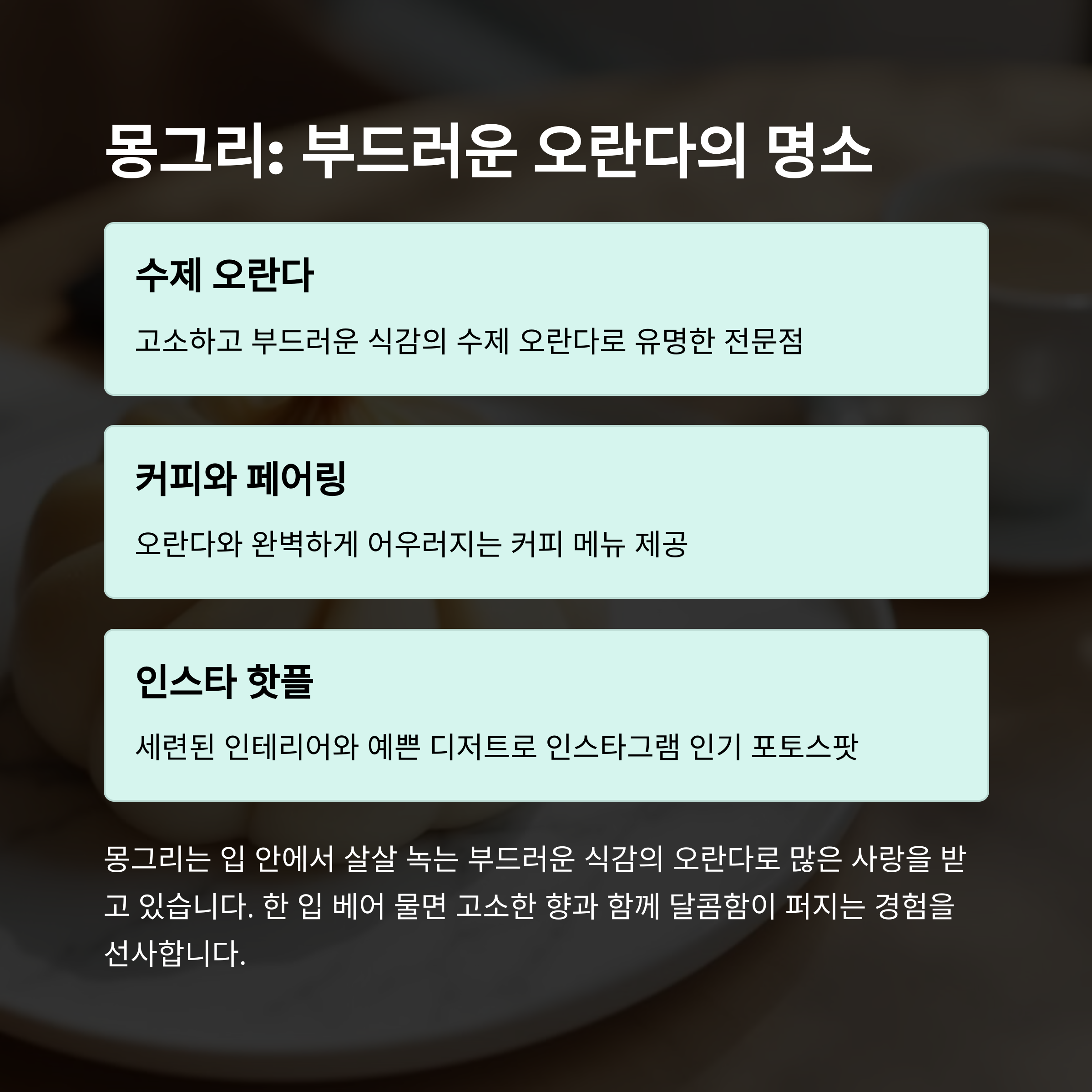 경주 황리단길에 들어서면 정겨운 돌담길과 함께 아기자기한 수제 디저트 매장이 눈길을 사로잡습니다. 특히 '몽그리'는 부드러운 식감의 수제 오란다로 여행자들의 입맛을 사로잡고 있습니다. 일반적인 오란다와는 달리, 전통 방식으로 만들어진 오란다는 견과류의 고소함과 함께 은은한 달콤함이 더해져 누구나 즐기기 좋은 맛을 자랑합니다. 이곳은 단순한 디저트 판매를 넘어, 커피와 함께 즐길 수 있는 감성적인 분위기 덕분에 잠시 머물며 휴식을 즐기기에 딱 좋은 공간으로 알려져 있습니다.