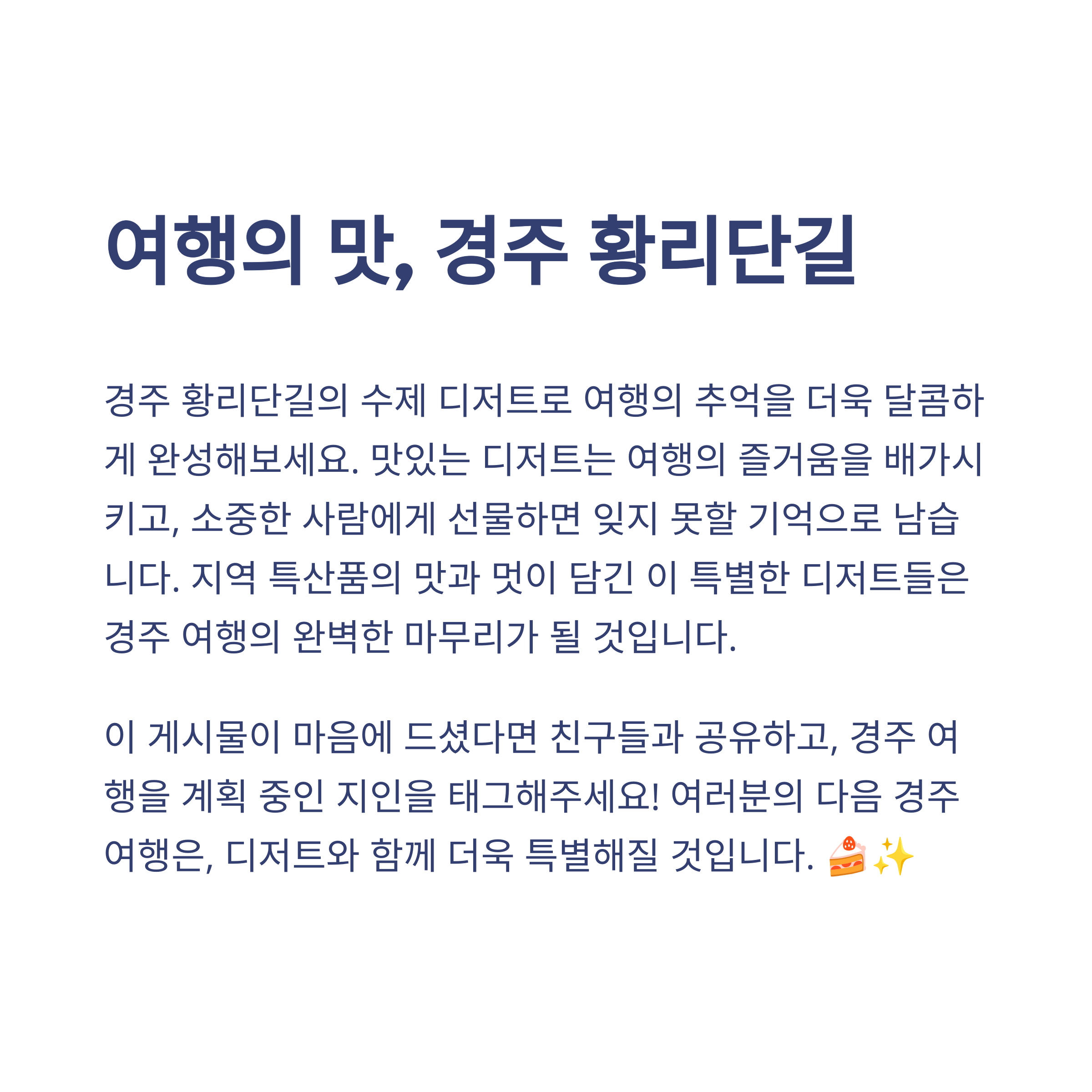 여러분은 경주 여행 중 어떤 디저트가 가장 기억에 남으셨나요? 혹은 이 글을 통해 새롭게 알게 된 곳이 있다면 공유해 주세요! 여러분의 여행 경험이 또 다른 이에게 소중한 정보가 됩니다.