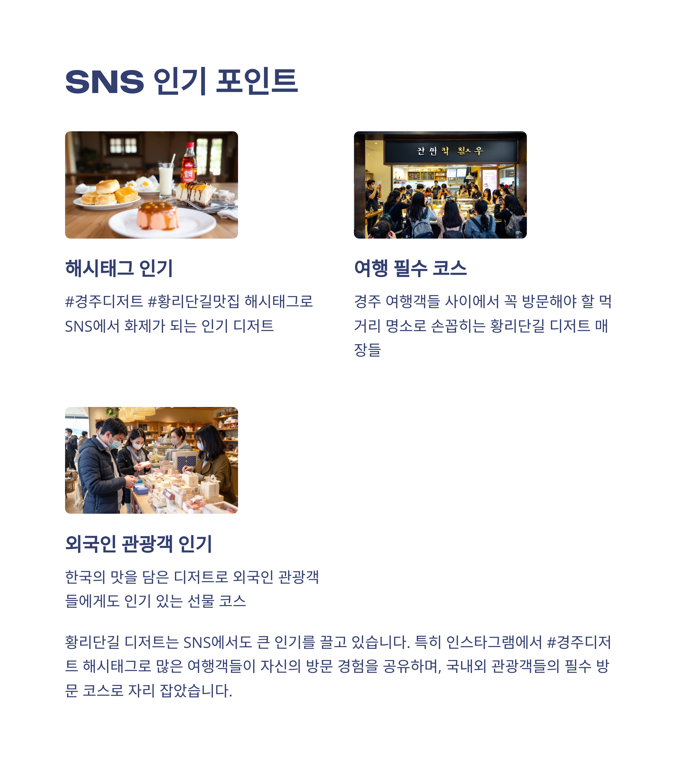 여행에서 돌아온 후에도 오랫동안 기억에 남는 건 바로 그 지역에서 맛본 특별한 디저트와 소중한 선물들입니다. 경주 황리단길은 최근 떠오르는 감성 여행지로, 단순히 사진 명소를 넘어 고급스러운 수제 디저트와 정성스러운 선물세트가 가득한 공간입니다. 황리단길에서는 단순한 간식이 아닌, 정성과 전통을 담은 다양한 수제 간식과 디저트를 매장에서 직접 제작하여 판매하고 있어 많은 여행자들에게 특별한 경험을 제공합니다.