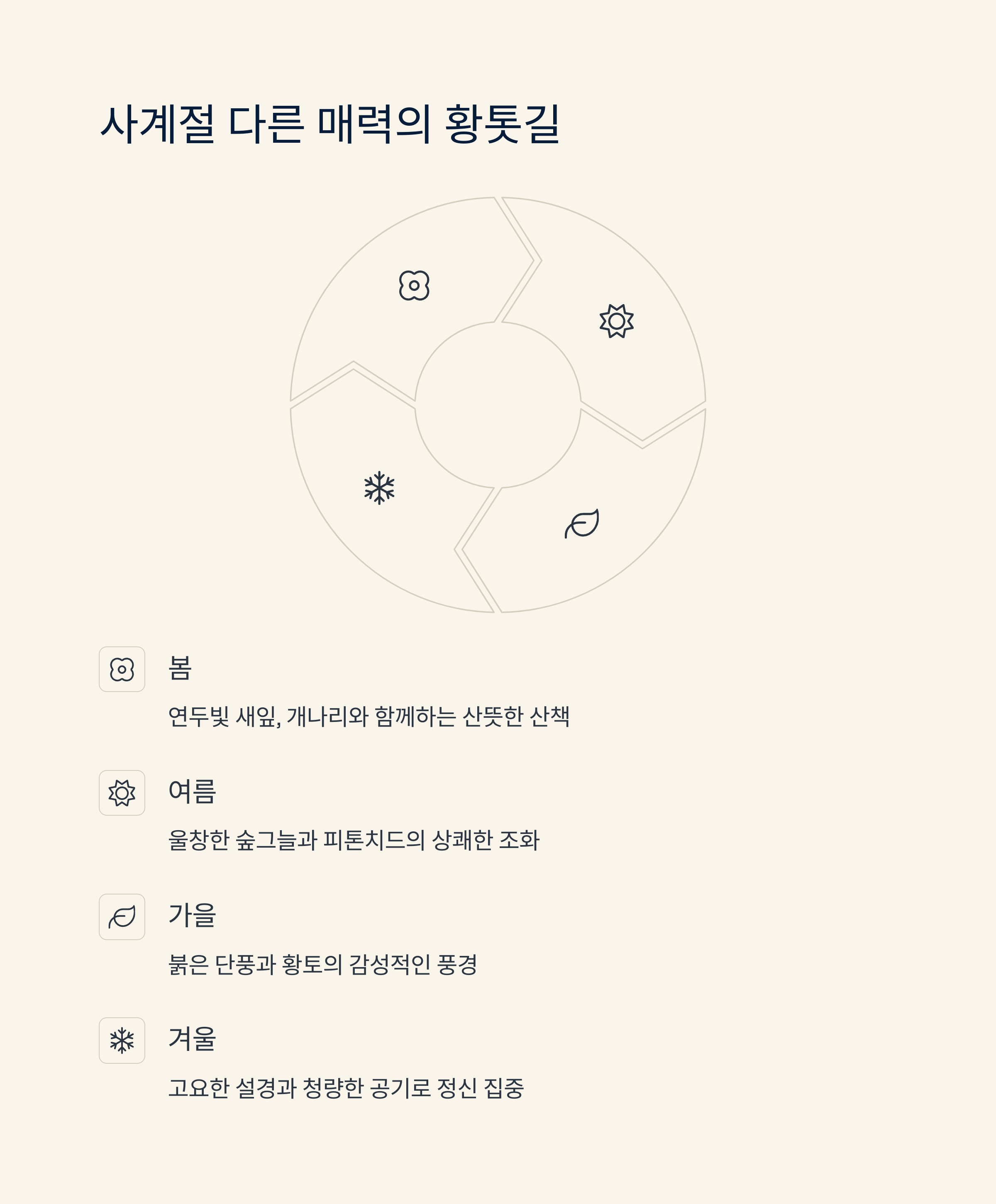 | 봄 | 연두빛 새잎, 개나리 | 산뜻한 기운으로 걷기 좋음 |