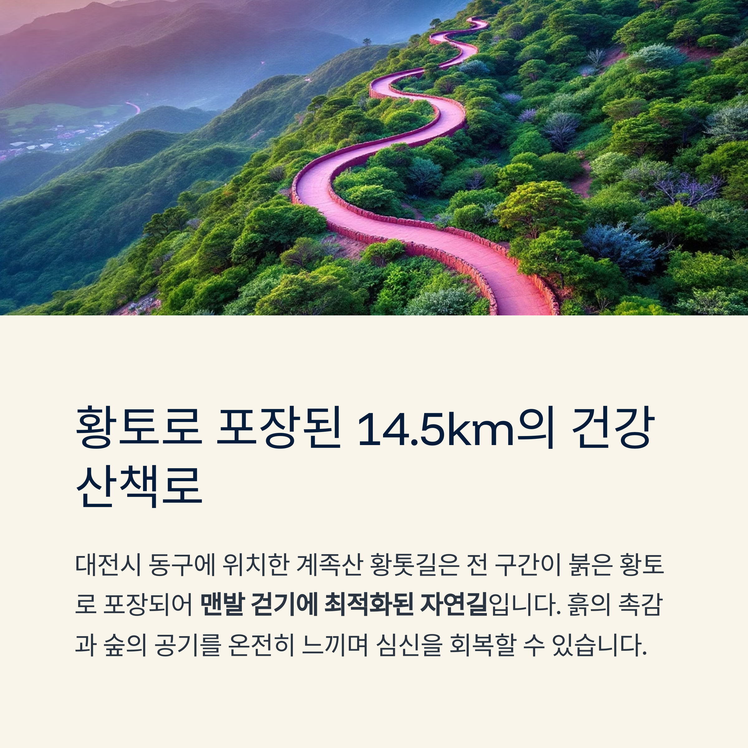 계족산 황톳길은 대전시 동구에 위치한 약 14.5km의 건강 산책로로,