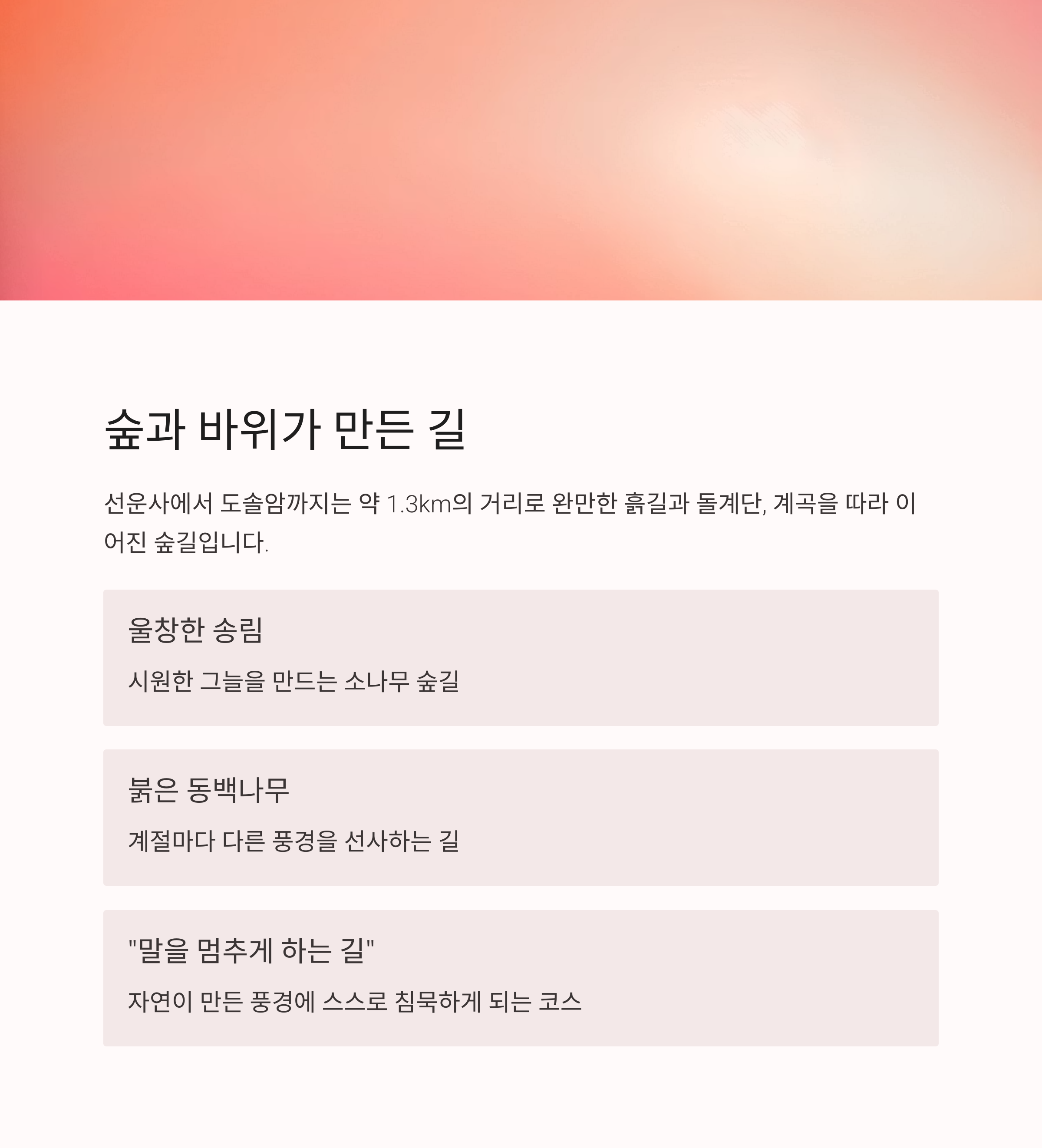 이곳은 걷는 것만으로도 충분한, 삶의 호흡을 다시 정돈하게 만드는 장소입니다.