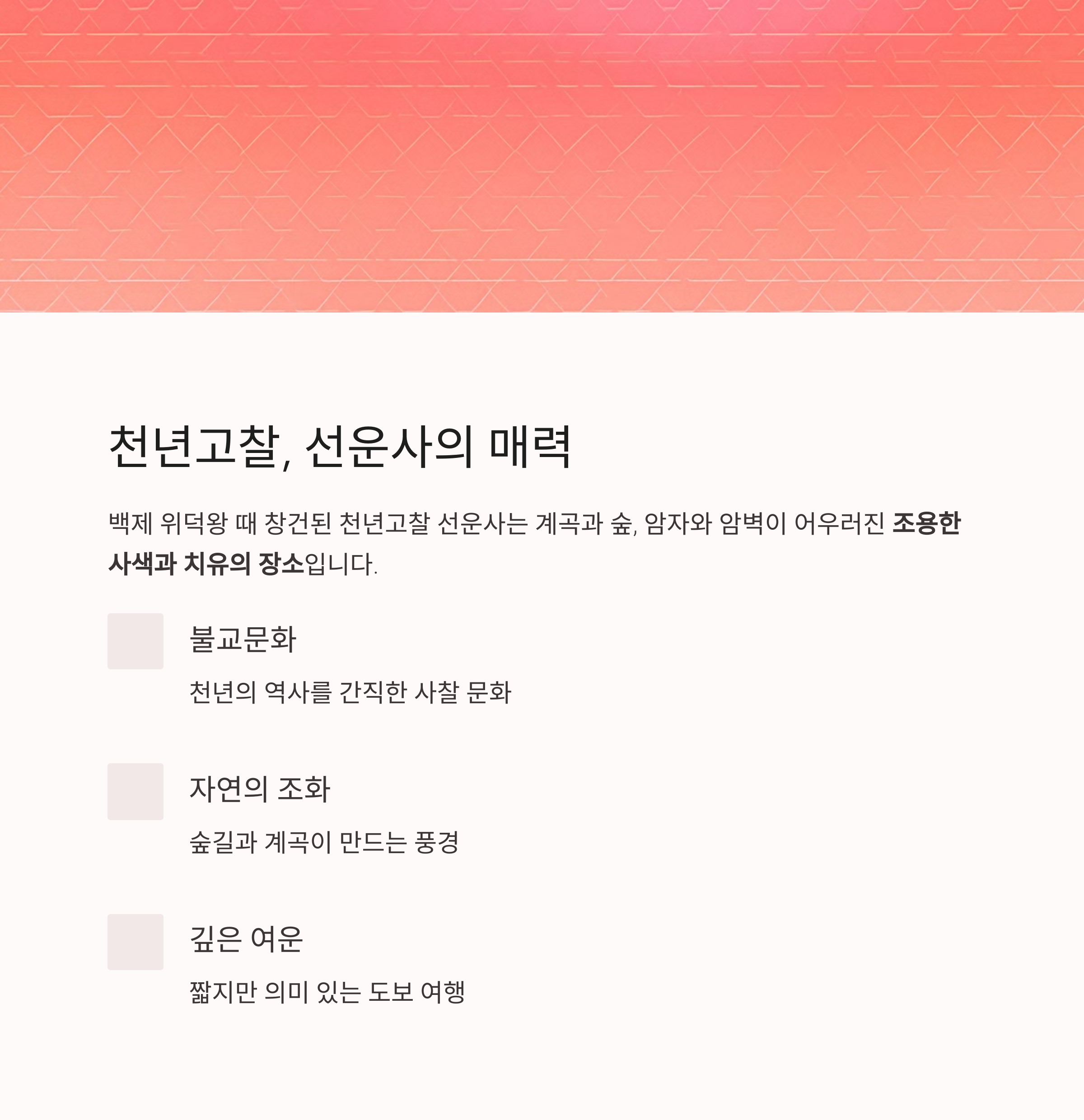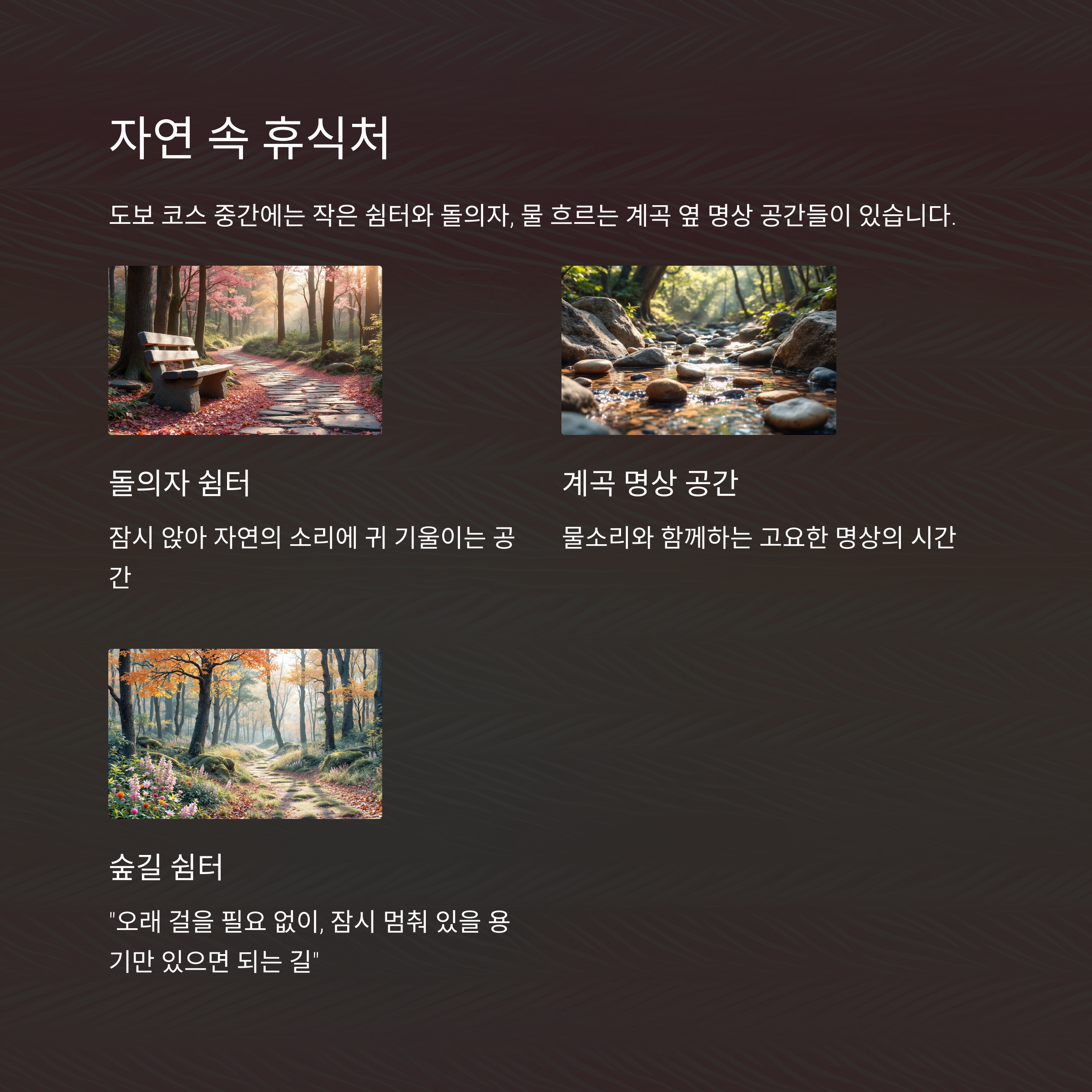 이 코스는 빠르게 걷는 길이 아니라, 천천히 머무는 길입니다.