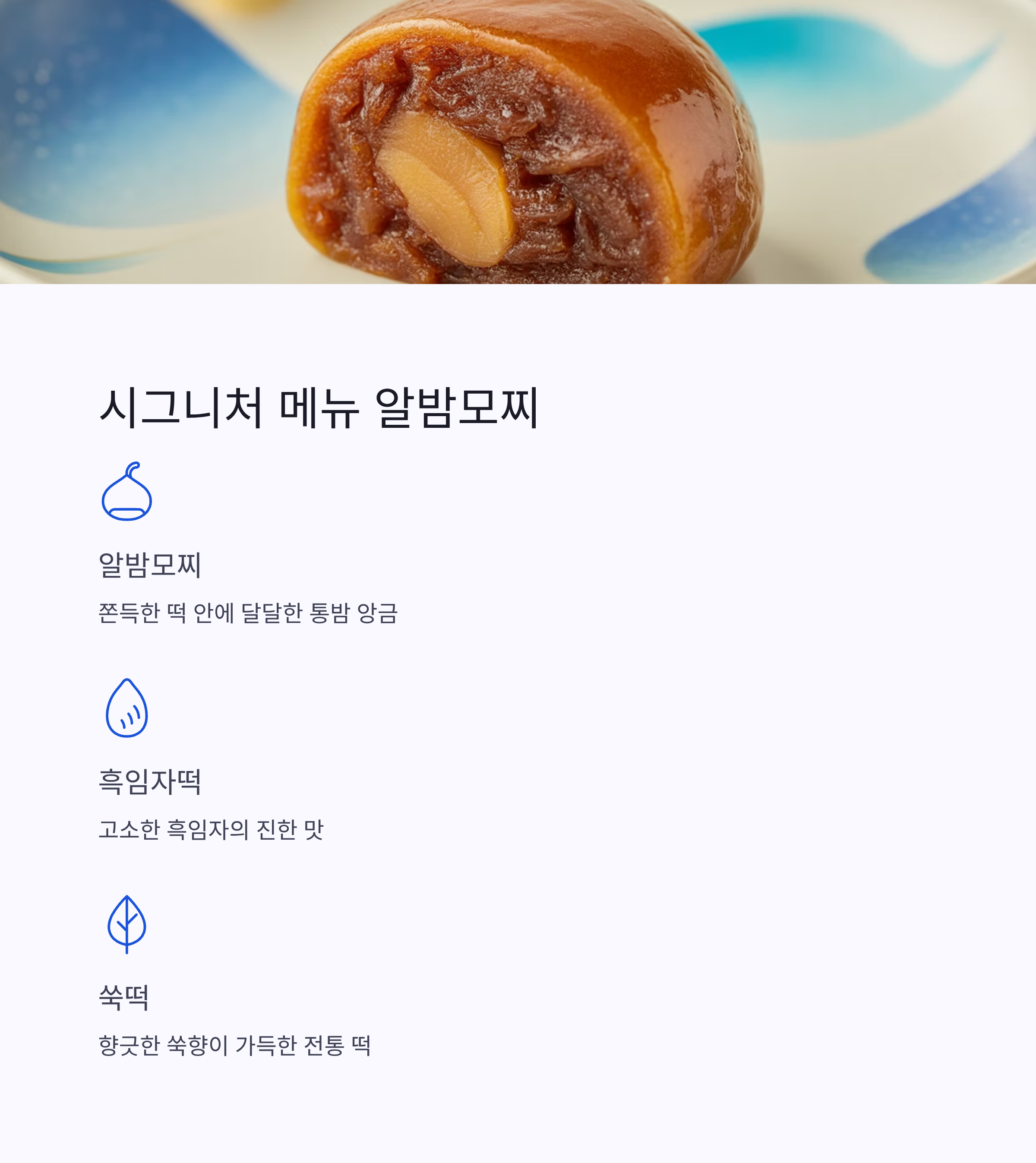 특히 알밤을 듬뿍 넣은 알밤찹쌀떡은 다른 지역에서는 쉽게 맛볼 수 없는 독특한 식감과 향이 살아있습니다.