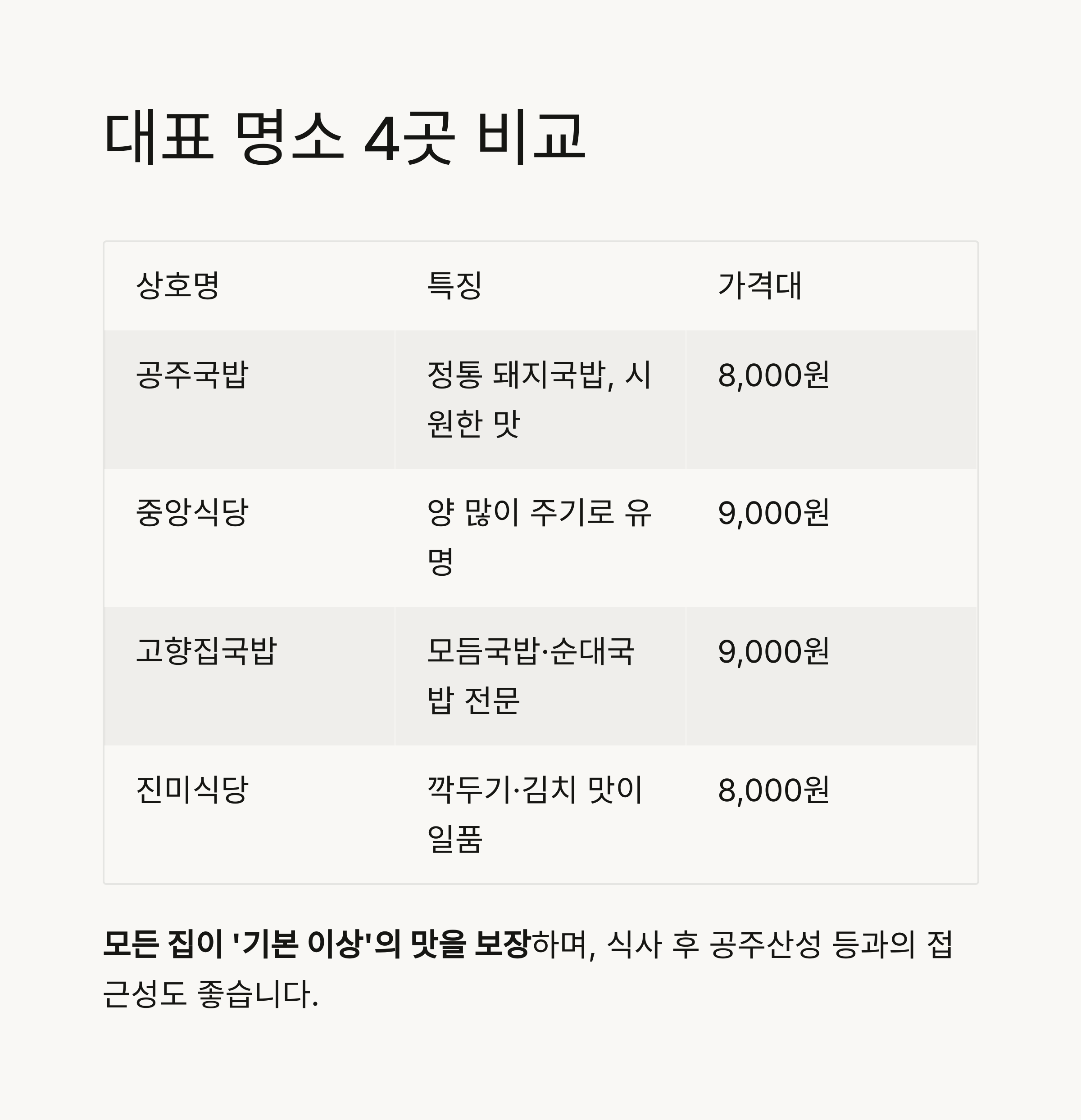 모든 집이 ‘기본 이상’의 맛을 보장하며, 식사 후 공주산성 등과의 접근성도 좋습니다.