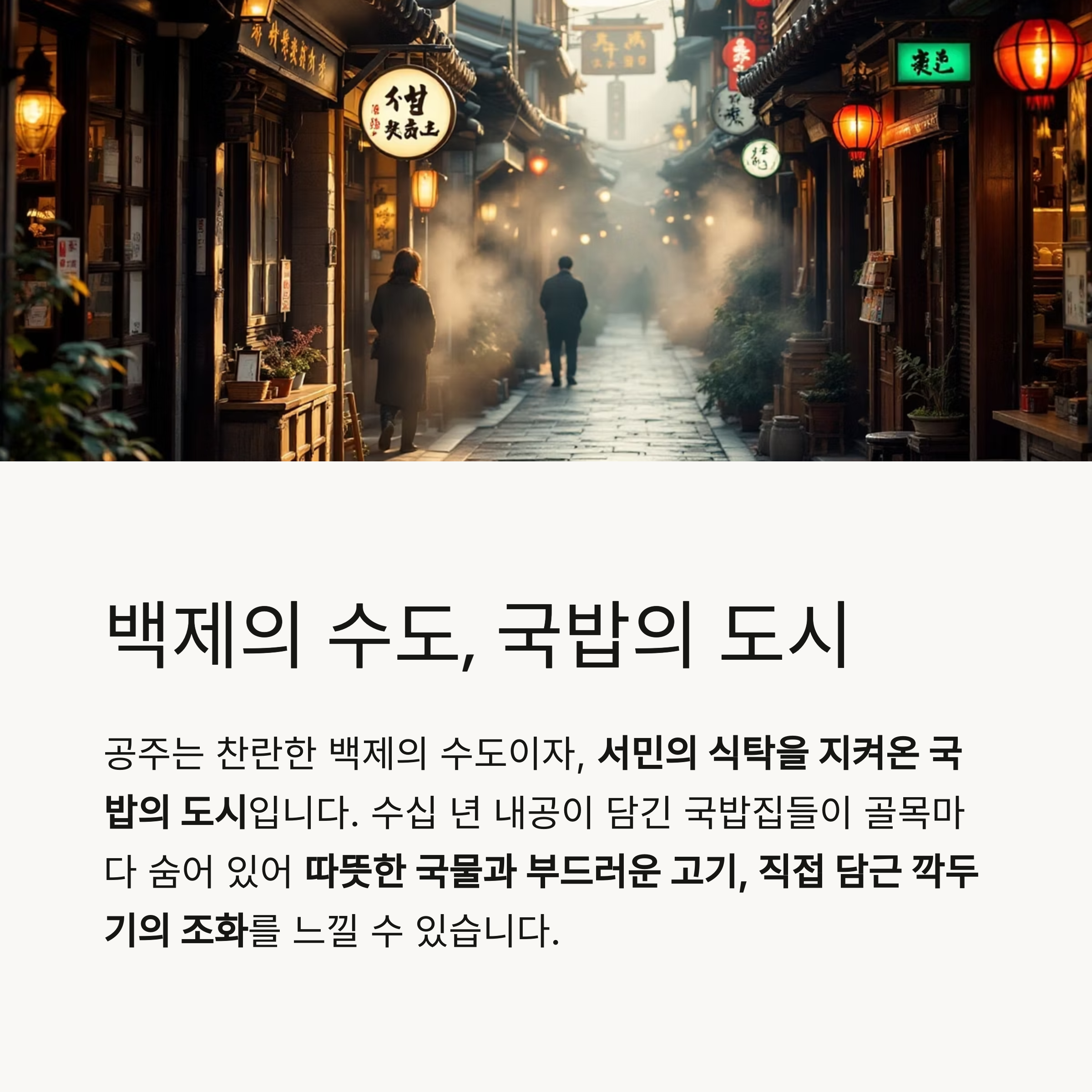 공주는 찬란한 백제의 수도이자, 서민의 식탁을 지켜온 국밥의 도시로도 잘 알려져 있습니다.