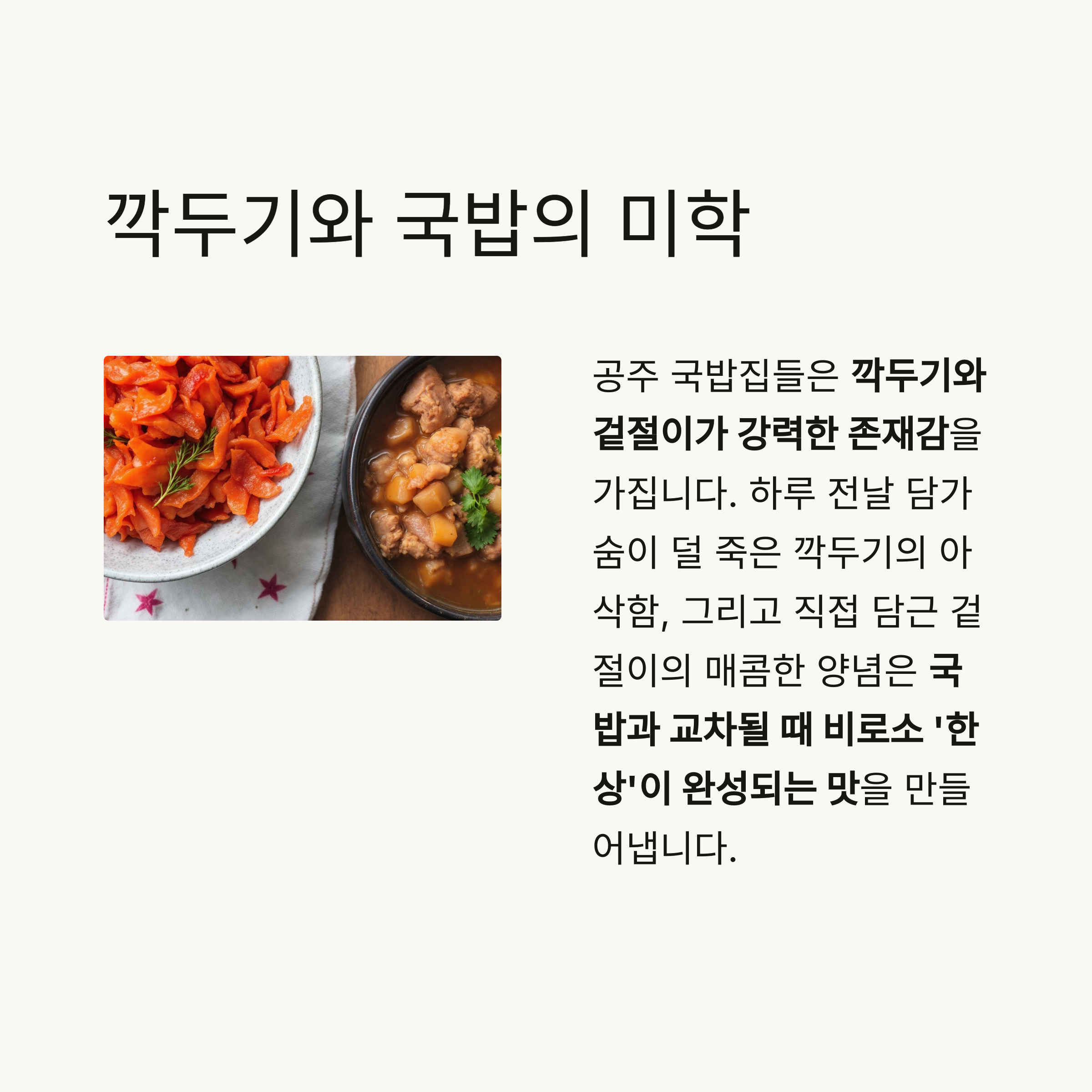 국밥과 교차될 때 비로소 ‘한 상’이 완성되는 맛을 만들어냅니다.