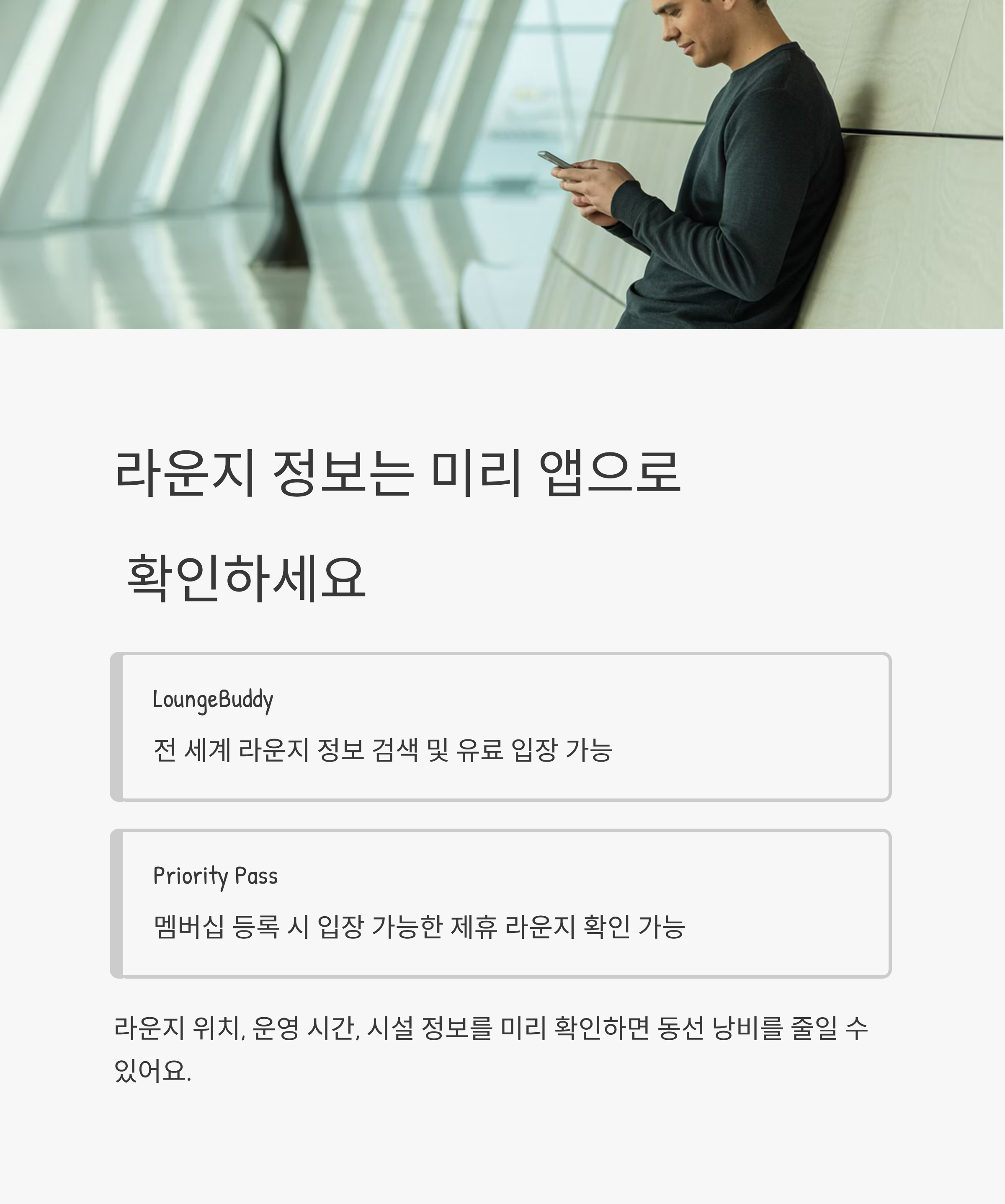 | Priority Pass | 멤버십 등록 시 입장 가능한 제휴 라운지 확인 가능 |