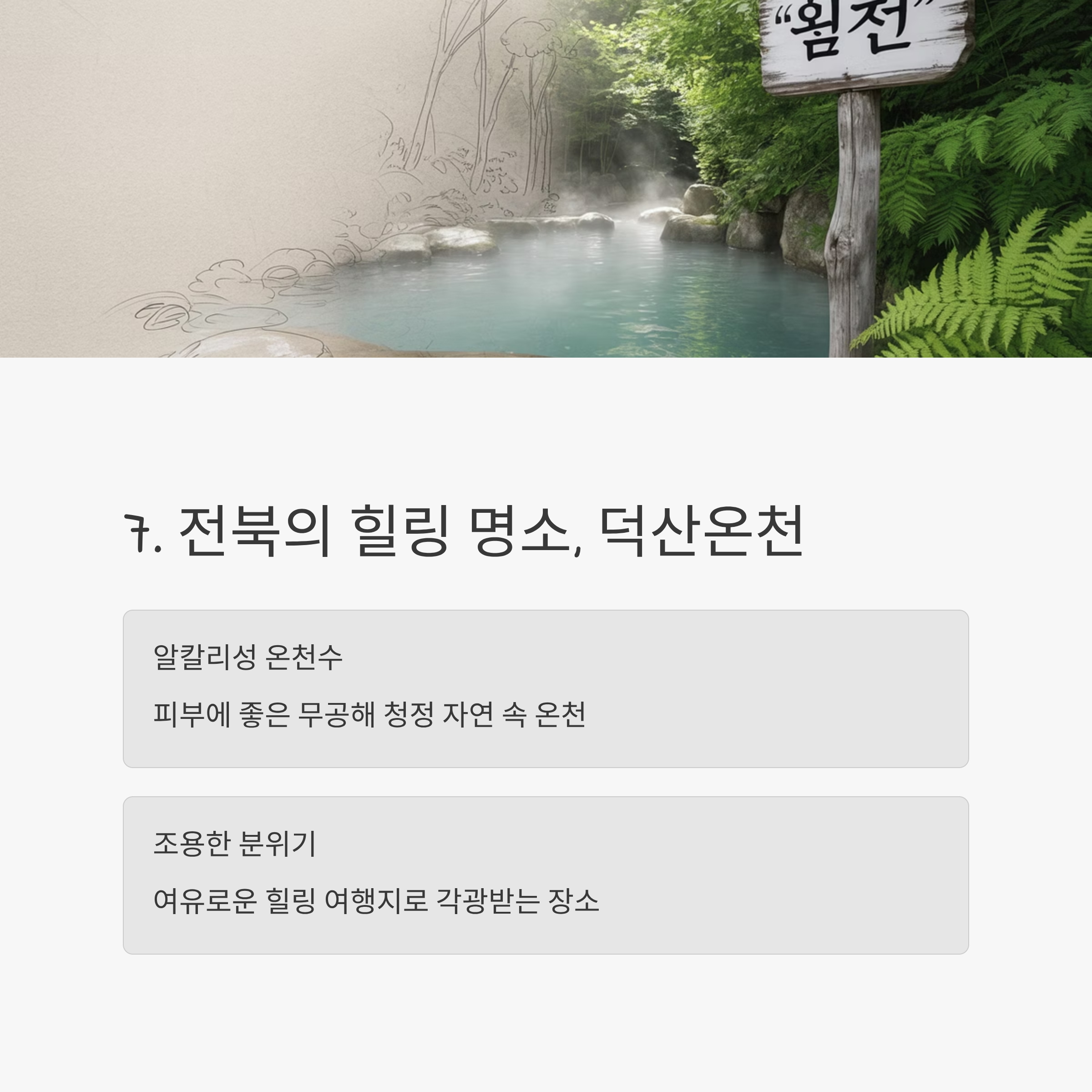 전라북도에 위치한 덕산온천은 무공해 청정 자연 속에서 즐기는 온천으로,