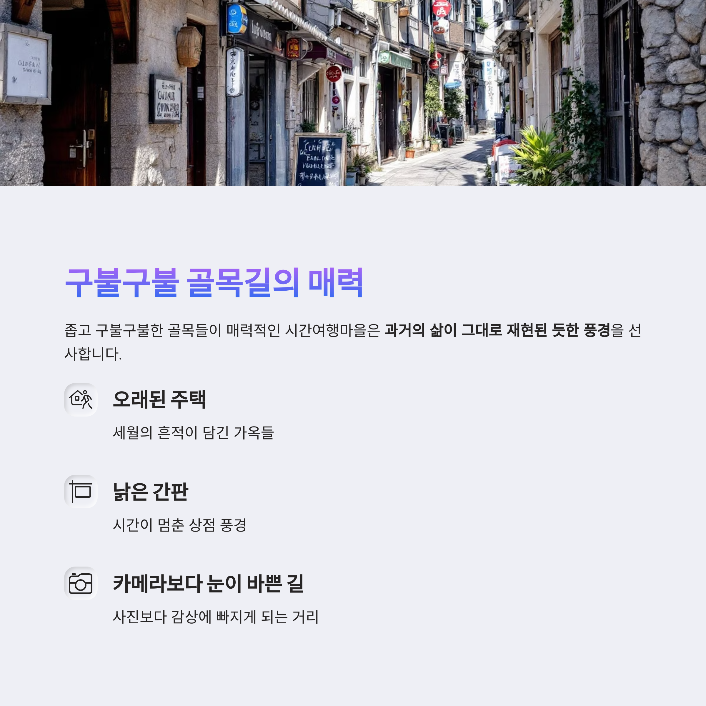 골목 사이로 오래된 주택, 낡은 간판, 세월의 흔적이 묻은 돌담이 이어져