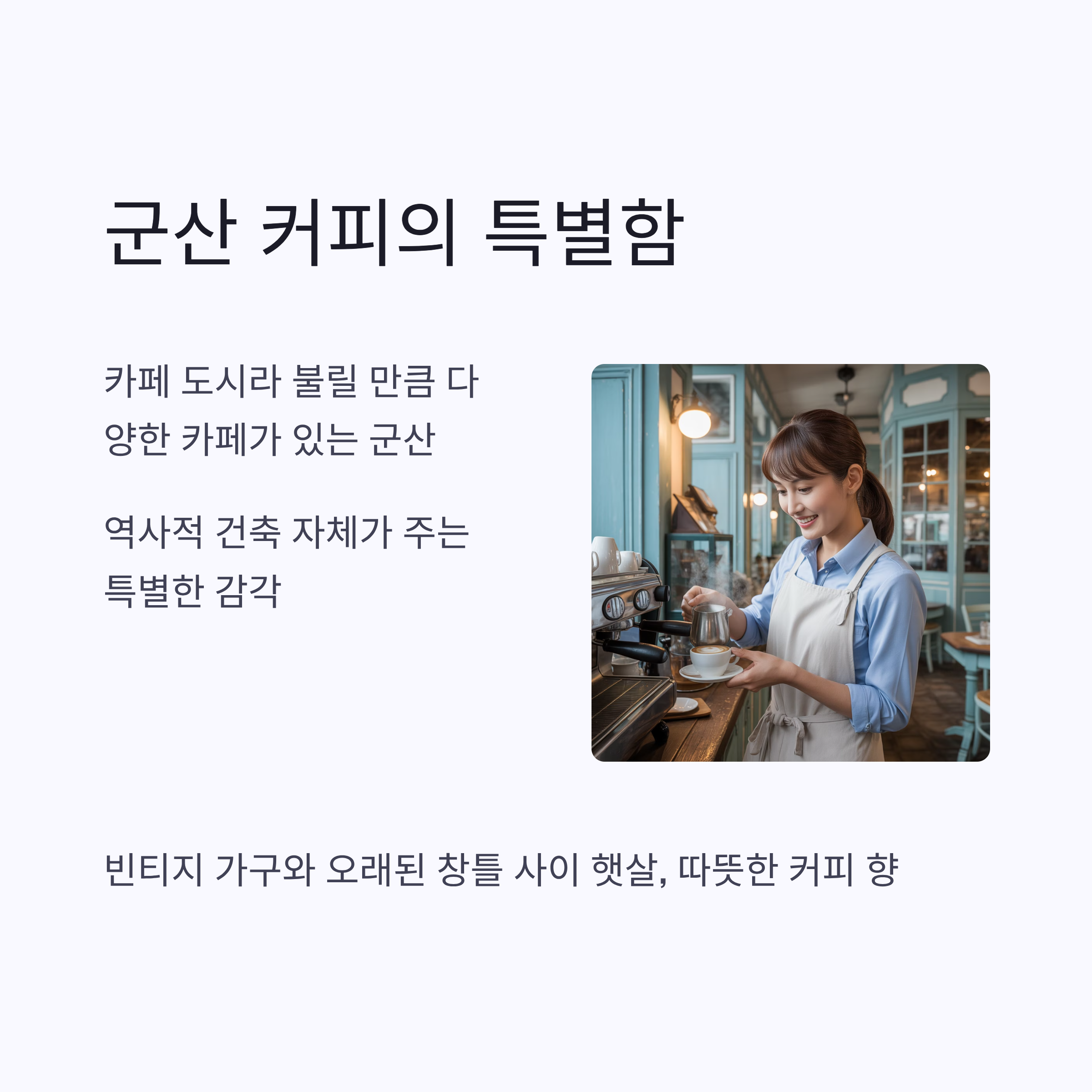 군산은 카페 도시라고 불릴 만큼 다양한 카페가 있어요. 그중에서도 시간여행 거리의 카페들은 건축 자체가 주는 역사적인 감각 덕분에 더욱 특별하죠. 빈티지 가구와 오래된 창틀 사이로 들어오는 햇살, 그리고 따뜻한 커피 향은 군산 여행만의 매력을 완성해 줘요.