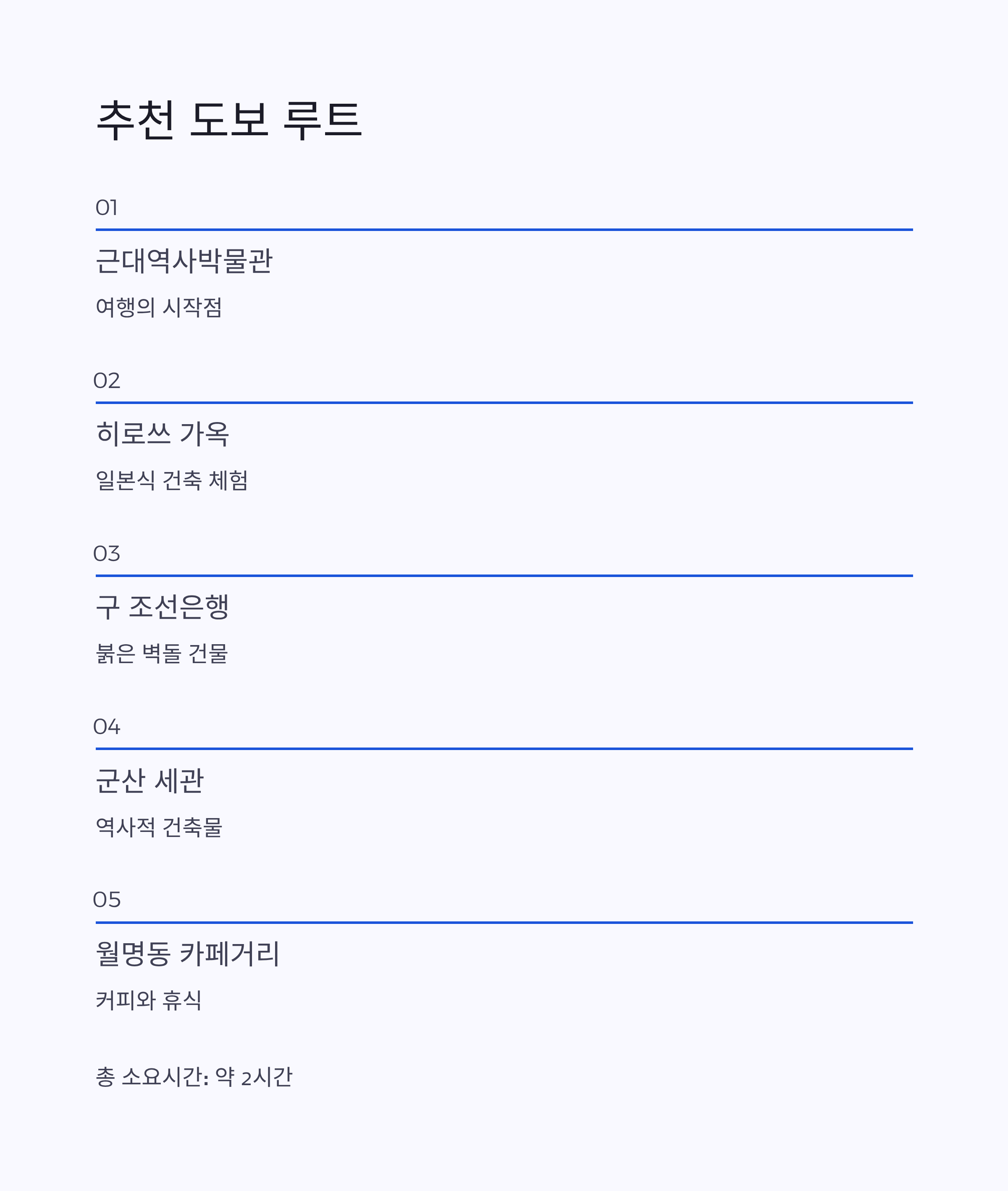 | 근대역사박물관 → 히로쓰 가옥 → 구 조선은행 → 군산 세관 → 월명동 카페거리 | 약 2시간 | 근대 건축, 카페, 골목 풍경 |