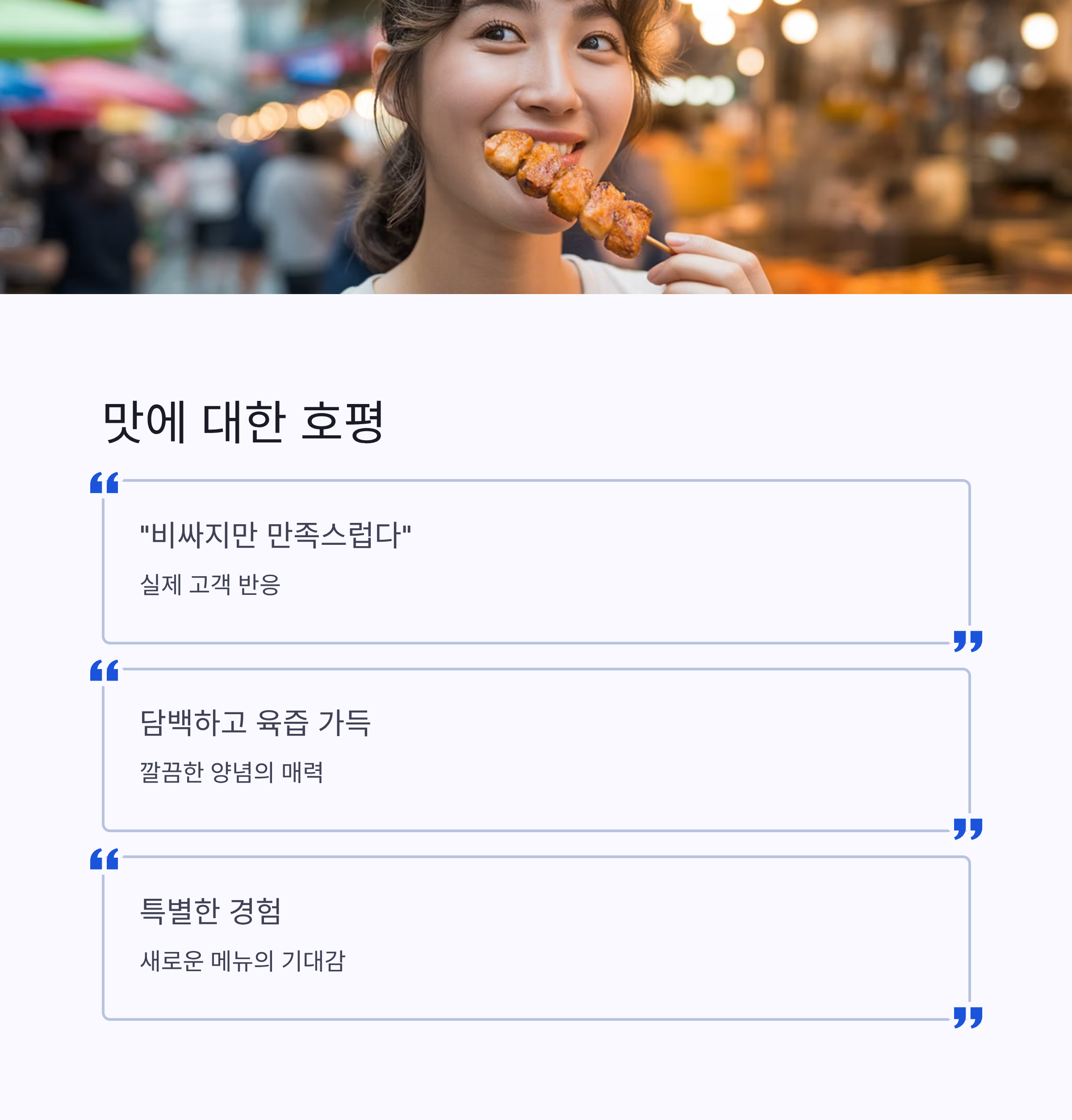 직접 먹어본 사람들은 "비싸지만 만족스럽다"는 반응을 보여요. 담백하면서도 육즙이 살아있고, 양념이 과하지 않아 깔끔하게 즐길 수 있다는 점이 장점이에요. 무엇보다 새로운 메뉴에 대한 기대감이 커서 더욱 특별하게 느껴지는 것도 사실이죠.