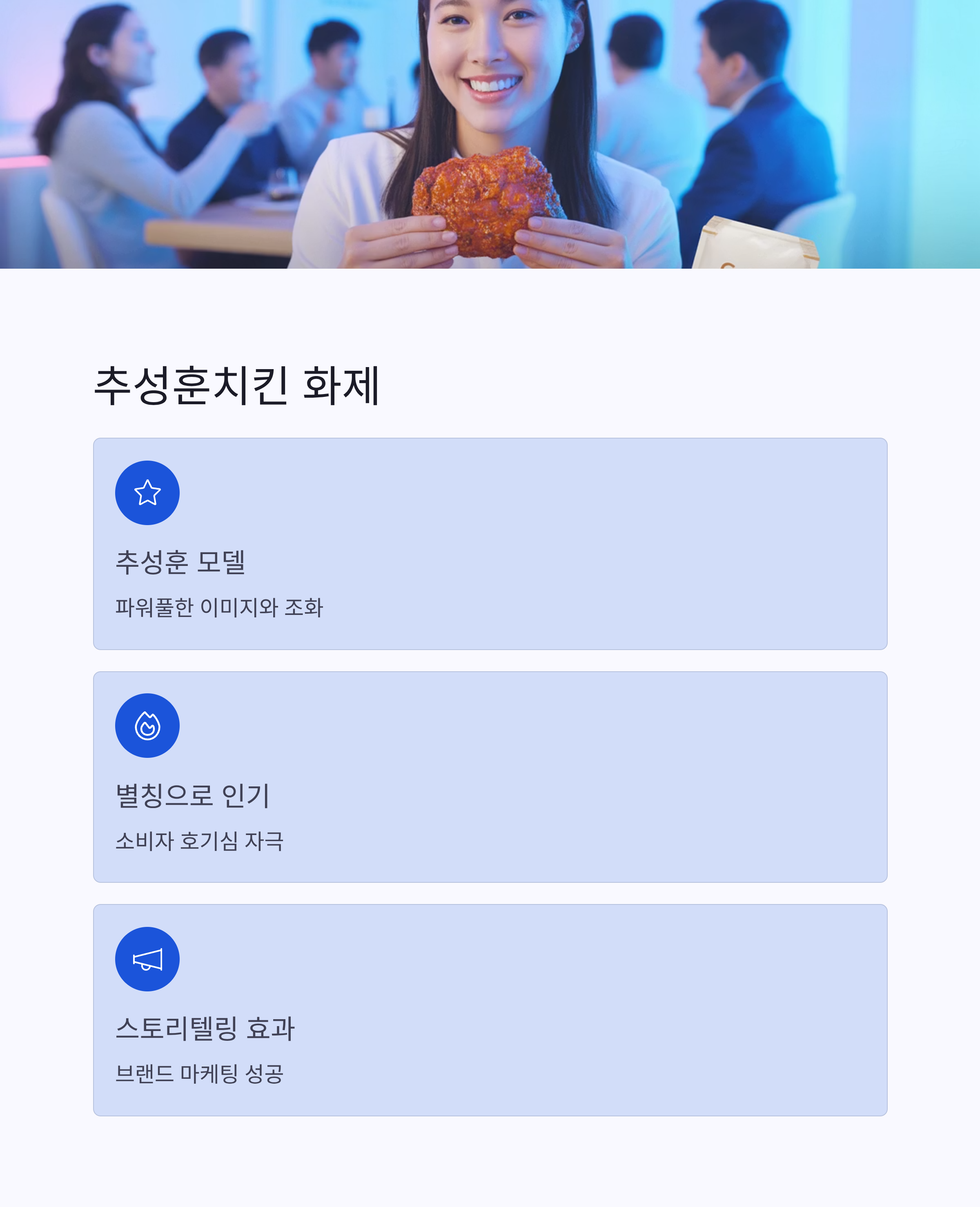 최근 장각구이는 '추성훈치킨'이라는 별칭으로 불리며 화제가 됐어요. 추성훈 선수가 광고 모델로 참여하면서 파워풀한 이미지와 잘 어울린다는 반응이 많아요. 이런 스토리텔링 요소가 소비자들에게 더 큰 호기심을 불러일으킨 것 같아요.