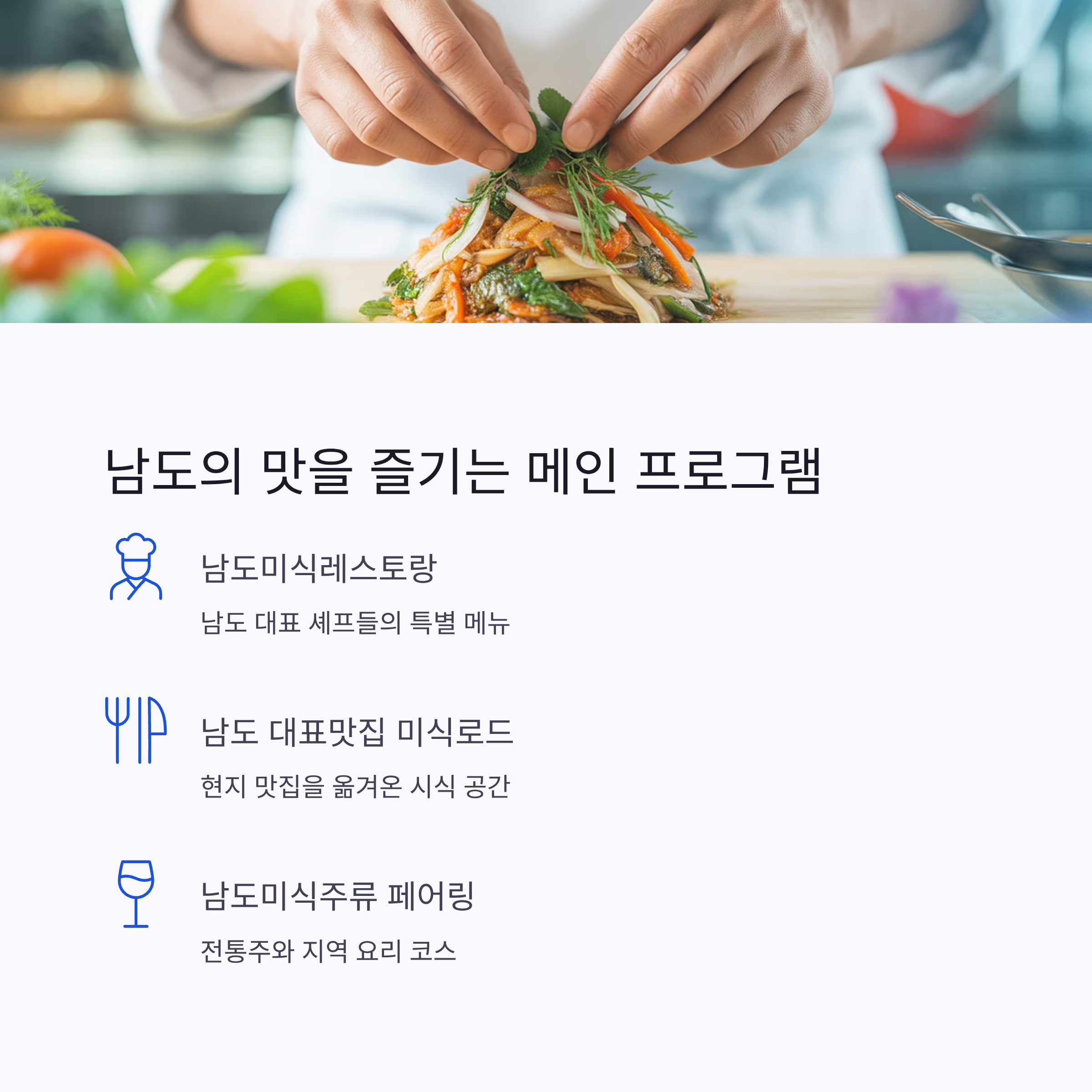 - 남도미식레스토랑: 남도의 대표 셰프들이 선보이는 특별 메뉴