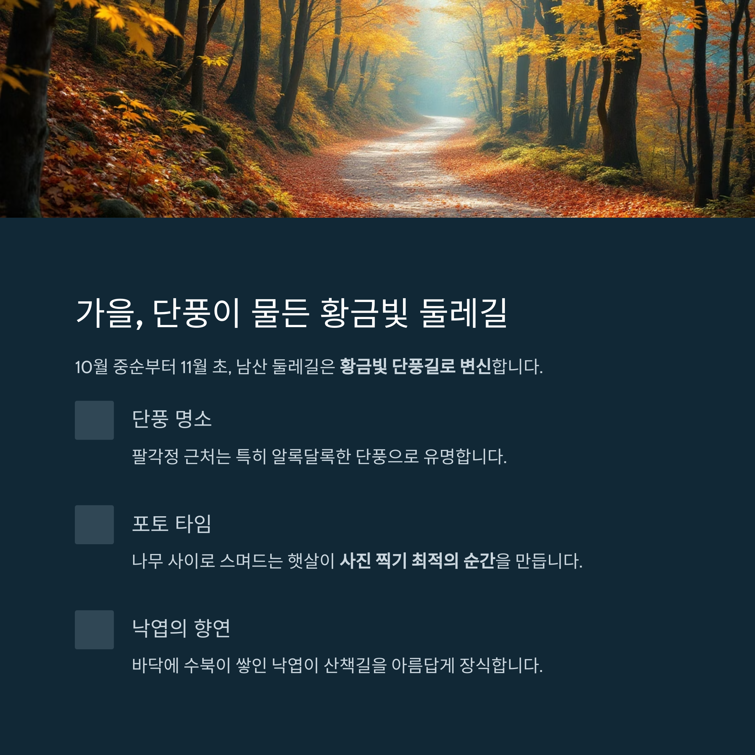10월 중순부터 11월 초까지, 남산 둘레길은 황금빛 단풍길로 변신합니다.