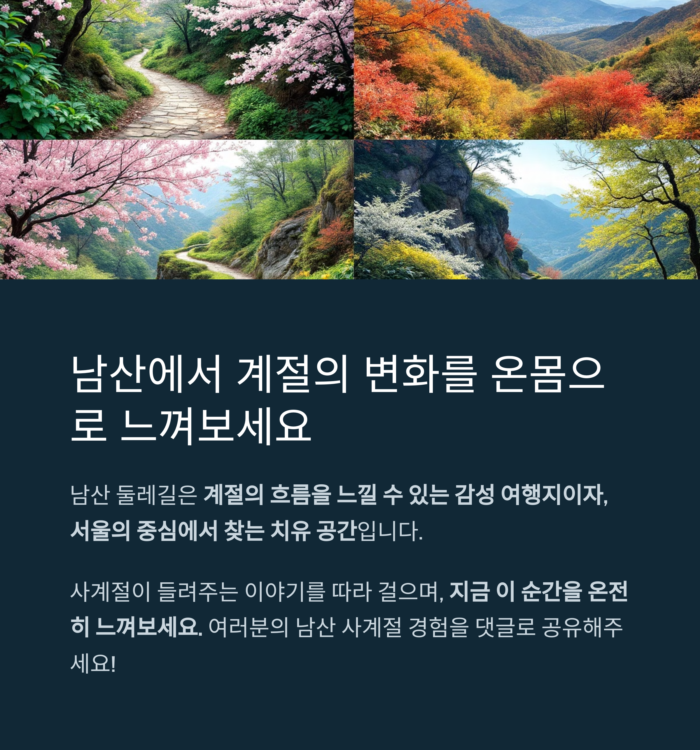 이 글에서는 봄, 여름, 가을, 겨울 사계절을 따라 남산 둘레길이 어떻게 변화하는지를 생생히 담아보고자 합니다.