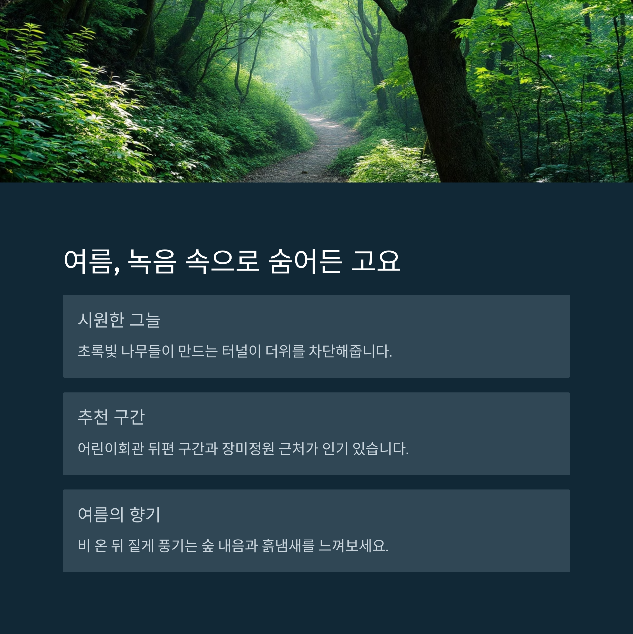 비 온 뒤 산책길에서는 숲 내음과 흙냄새가 짙게 풍기며, 장미정원 근처에서는 다양한 여름 꽃도 만날 수 있습니다.