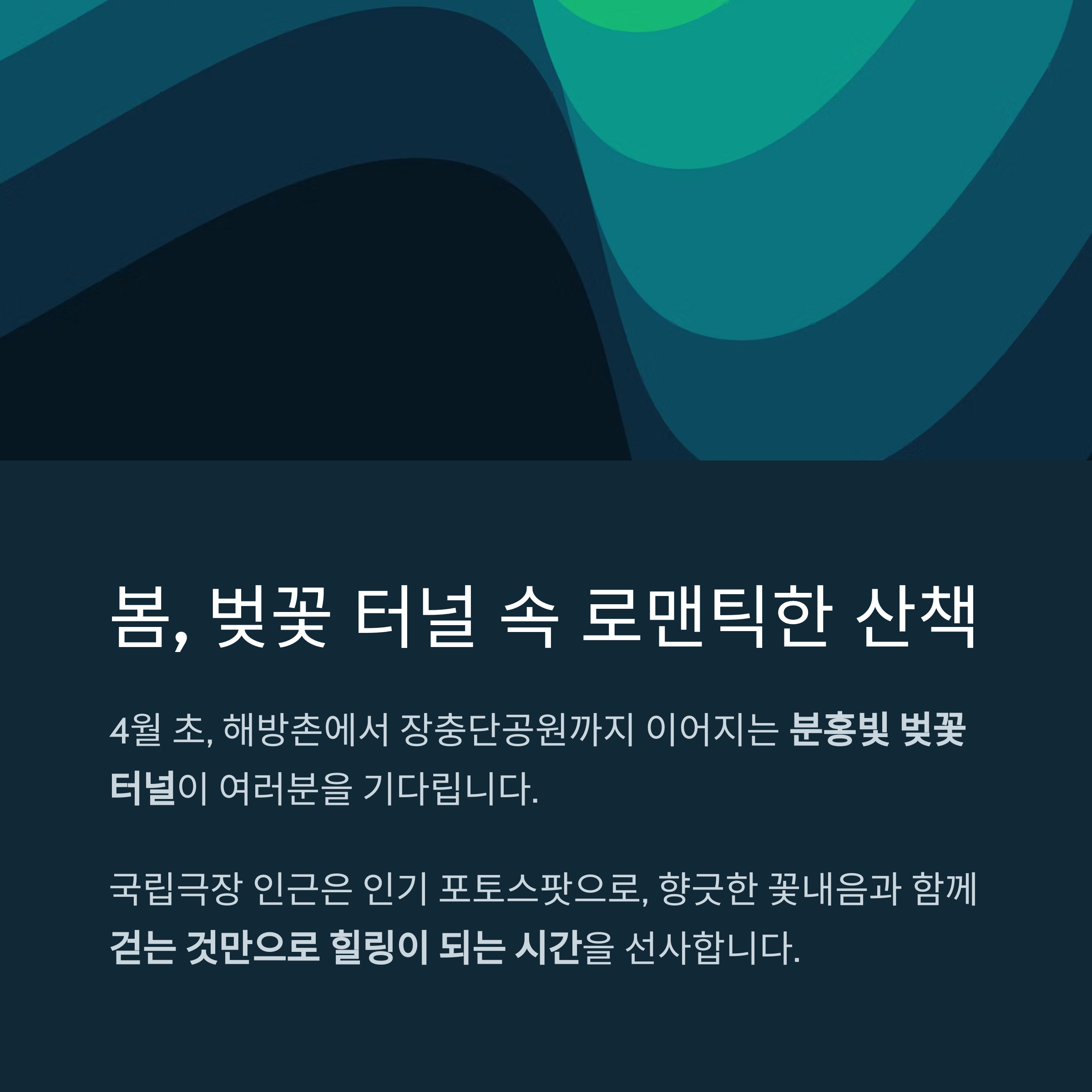 | 봄 | 장충단공원~국립극장 | 벚꽃 터널, 봄꽃 향연 |