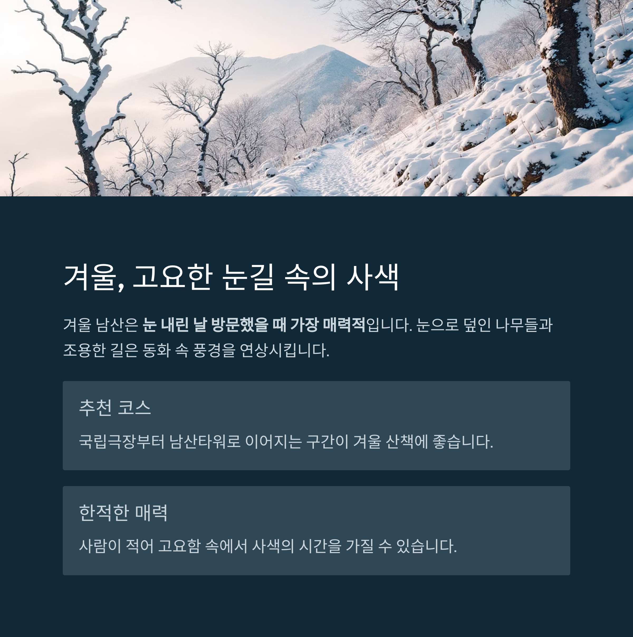 | 겨울 | 국립극장~남산타워 | 눈 덮인 길, 고요한 분위기 |