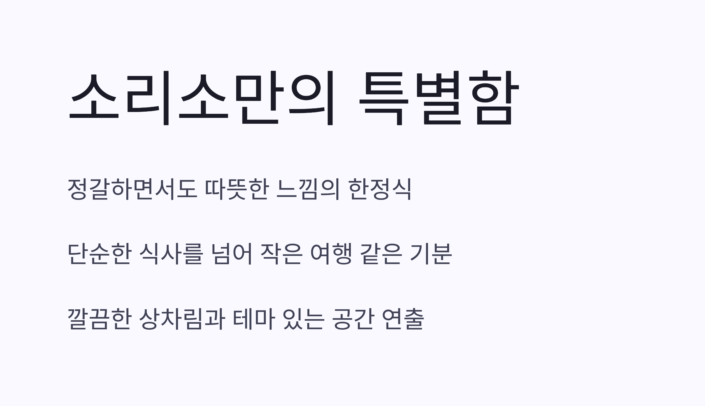 한정식이라고 하면 조금 격식 있고 무거울 수 있는데, 소리소는 친근하면서도 특별한 느낌을 줬어요. 깔끔하게 차려진 상차림과 따뜻한 분위기 덕분에 누구와 가도 만족할 만한 곳이라는 생각이 들었어요.
