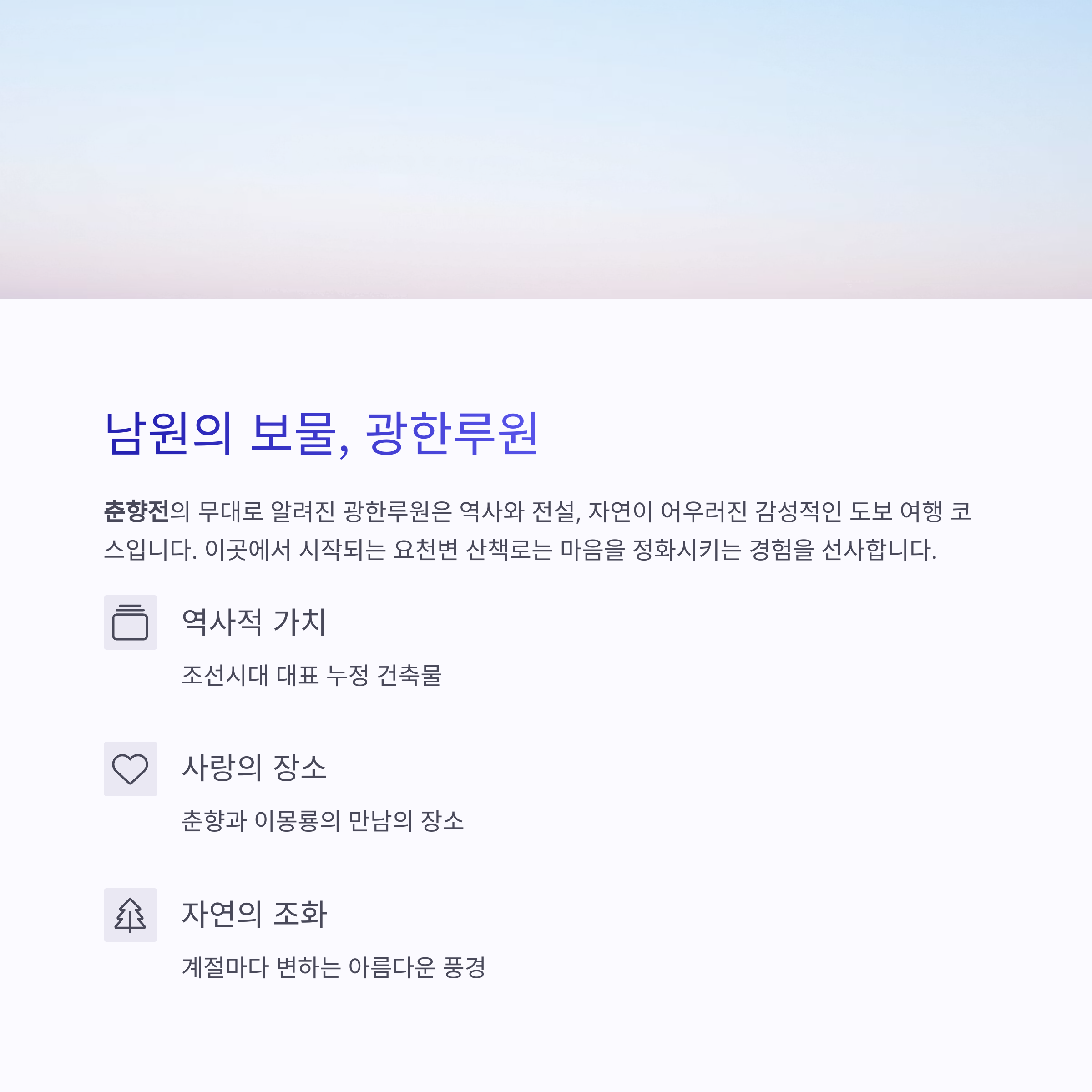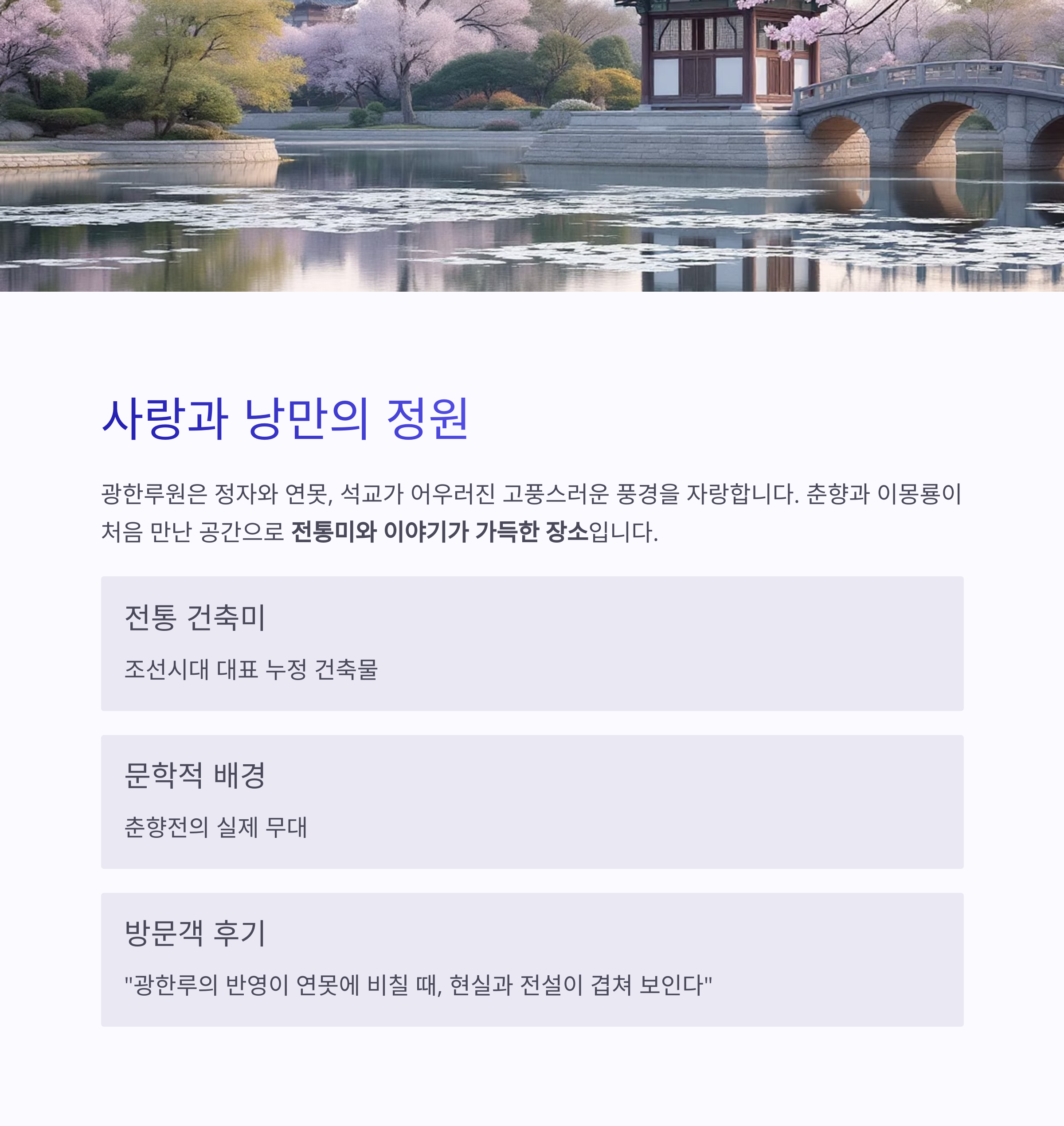 "광한루의 반영이 연못에 비칠 때, 현실과 전설이 겹쳐 보인다"는 후기가 많습니다.