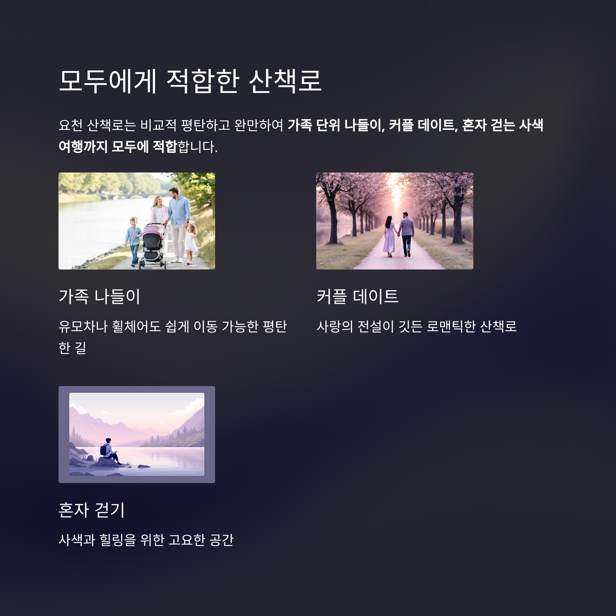 가족 단위 나들이, 커플 데이트, 혼자 걷는 사색 여행까지 모두에 적합합니다.