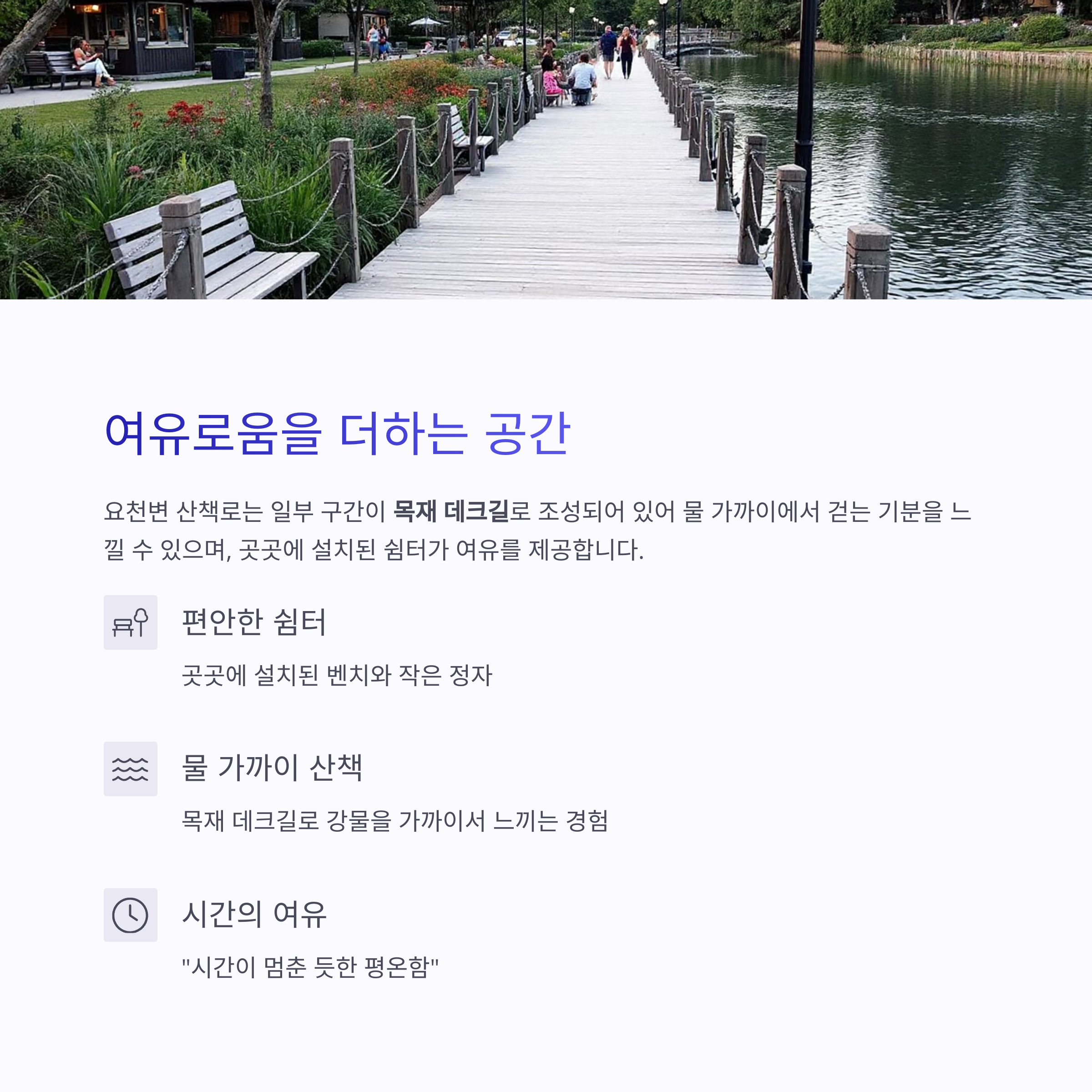 강변 데크길과 쉼터, 여유로움을 더하는 공간