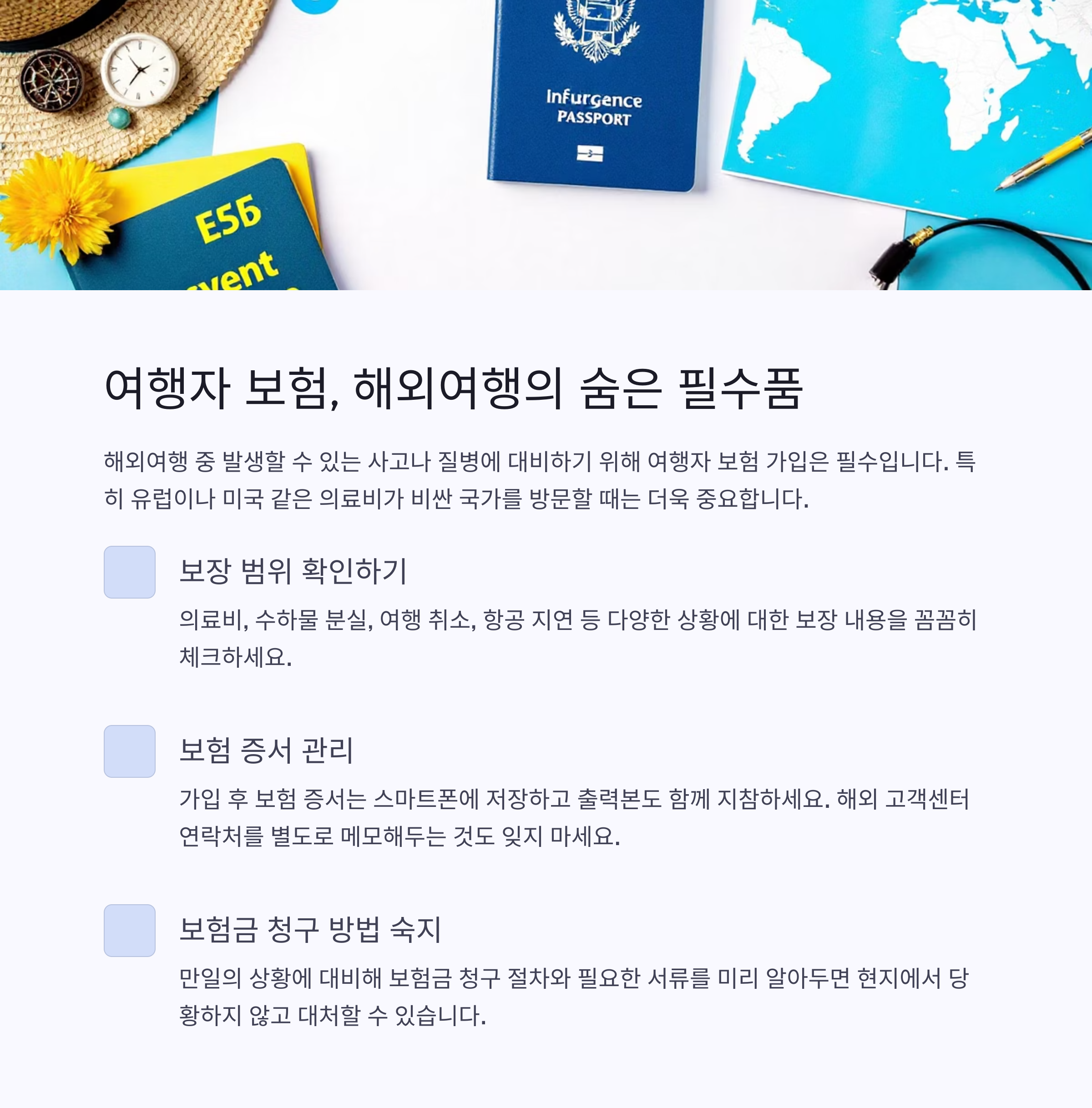예상치 못한 사고나 질병에 대비하려면 여행자 보험 가입은 필수입니다.
